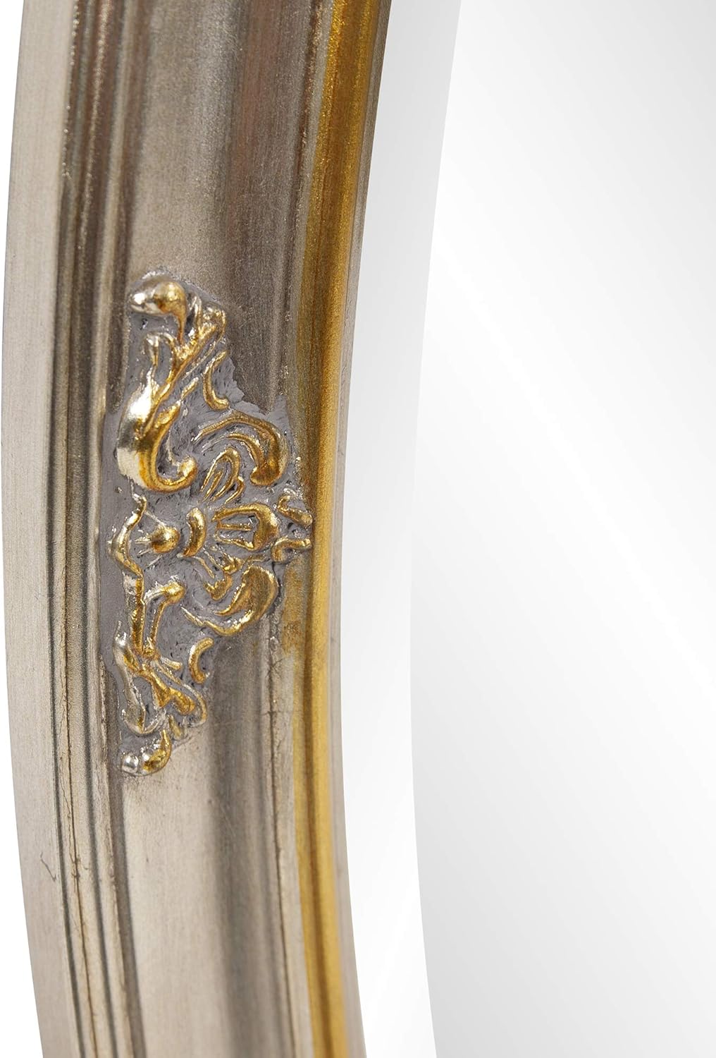 - EMBELLISHED ACCENTS - The stainless steel resin framed antique decorative mirror features gold leaf and decorative adornments on each side of the frame, and is painted in a lovely antique silver & gold leaf hand applied finish