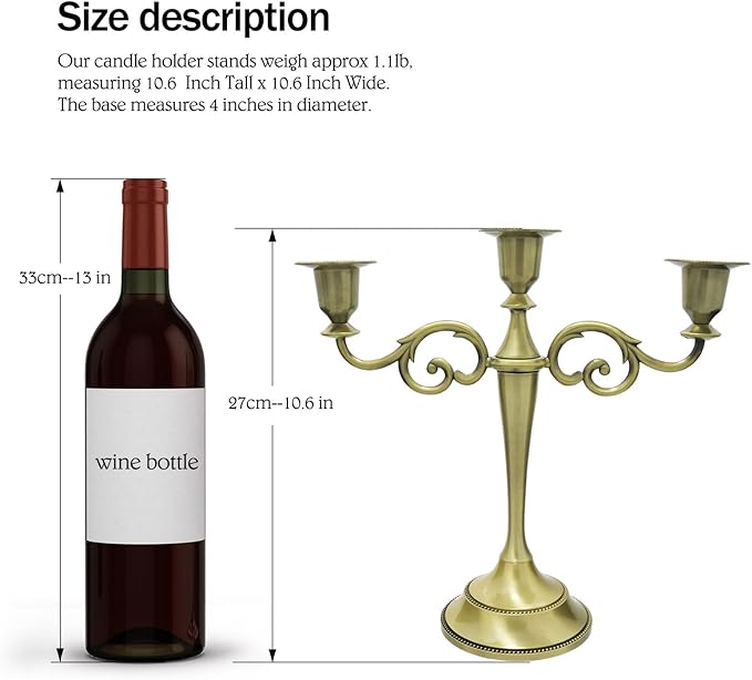- 【 Premium Metal Construction 】 – We at Viscacha have constructed premium metal candelabras for more than 15 years. Our company uses state of the art metal plating technology to provide different candelabra colors for your selection. Our candle holder stands weigh approx. 0.9 lb, measuring 10.6 Inch Tall x 10.6 Inch Wide. The base measures 4 inches in diameter.