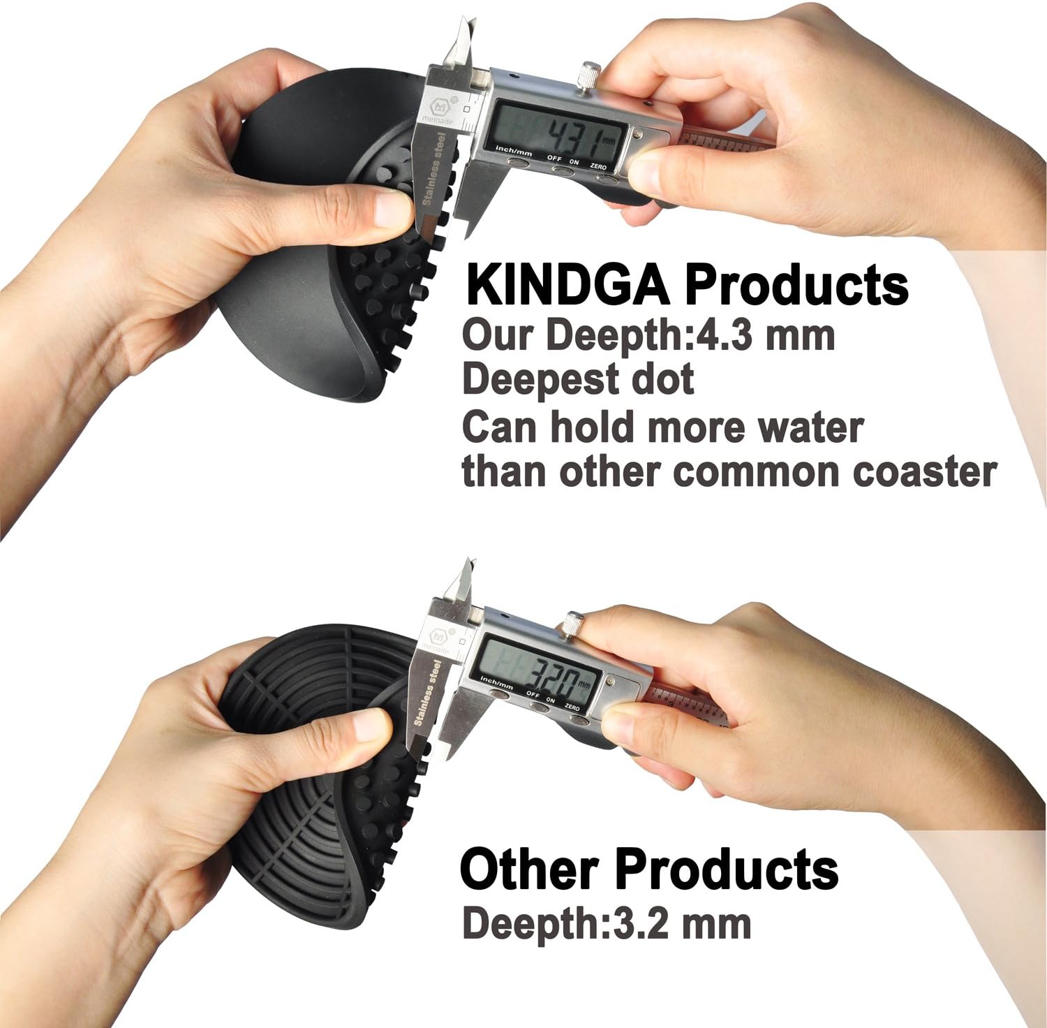 - [Perfect Size & Deep Tray]: Kindga large drink coasters diameter 4.3 inches coasters can fit any large & small mug, cup or bottle. And the deep groove of 4.3 mm, an upgraded version compared to the common version on the market. The upgrade version flat cool rubber coasters for drinks can protect your desk well.