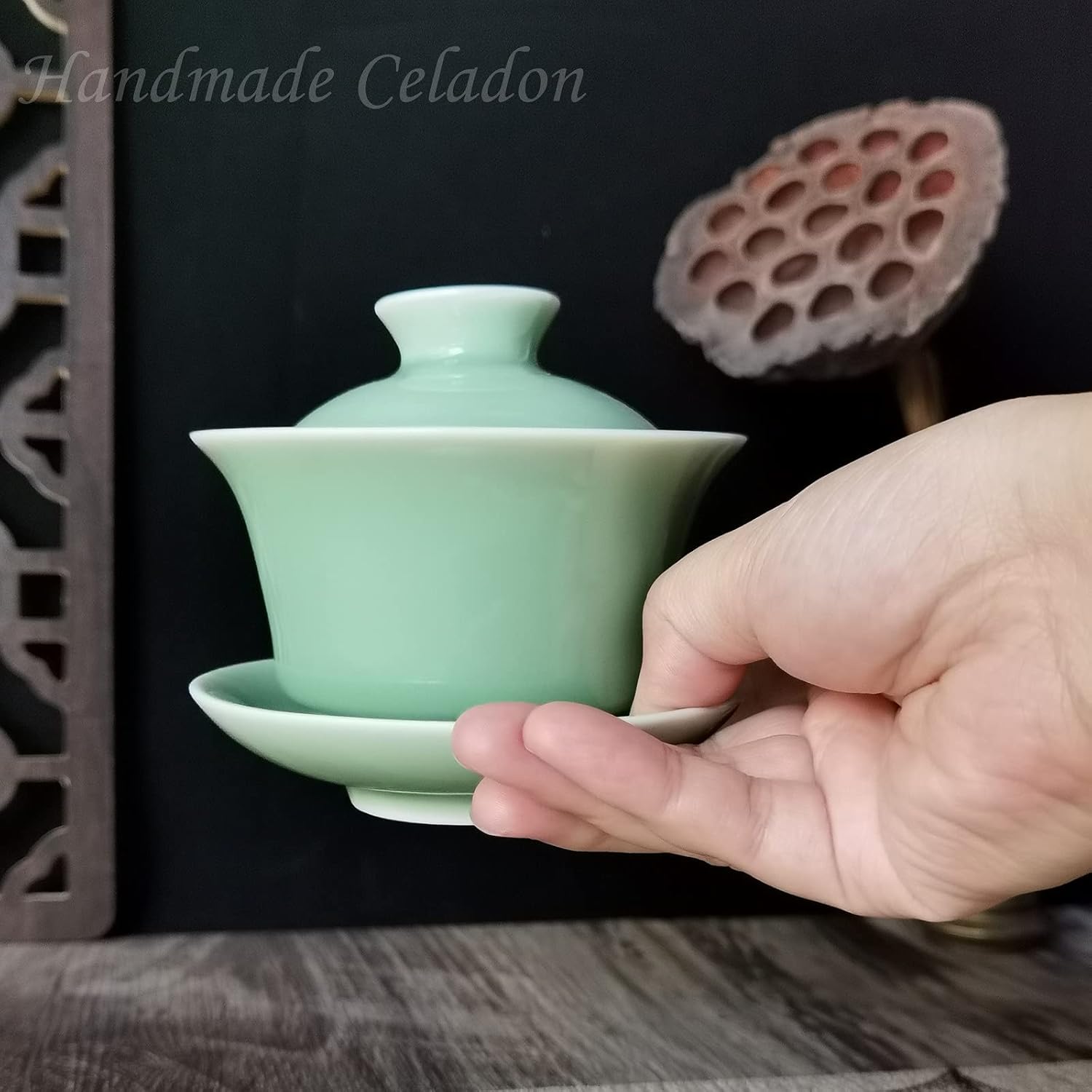 Gaiwan Kung Fu Teacups with Lid 5-Ounce Teacup and Saucer Set Porcelain Chinese Celadon(Green)