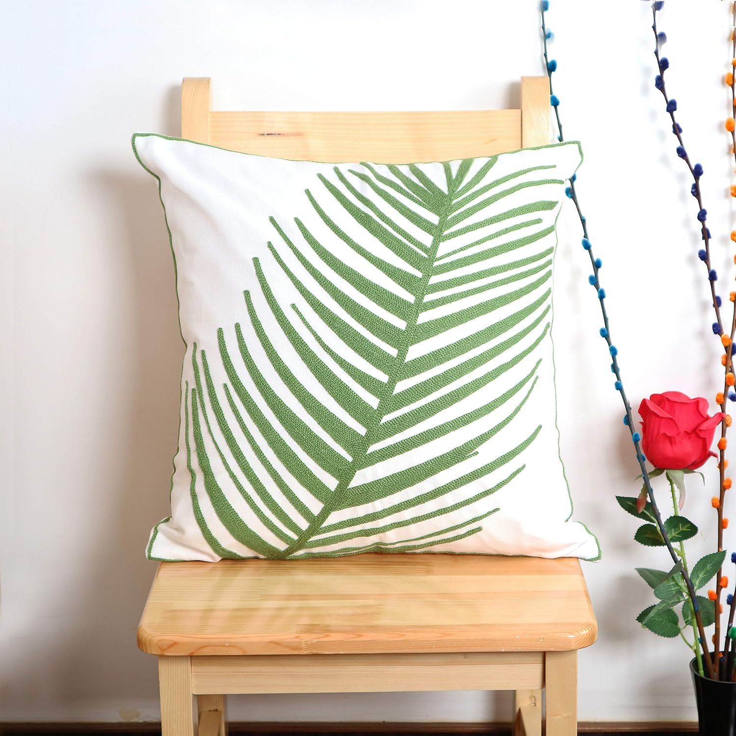 Embroidery Throw Pillow Cover 18x18 Decor Tropical Leaves Floor Pillow Cover for Couch Chair Bed Room 100% Cotton Cushion Cover 45x45cm Pillowcase, Green Leaf Plant Embroidered, Pack of 4