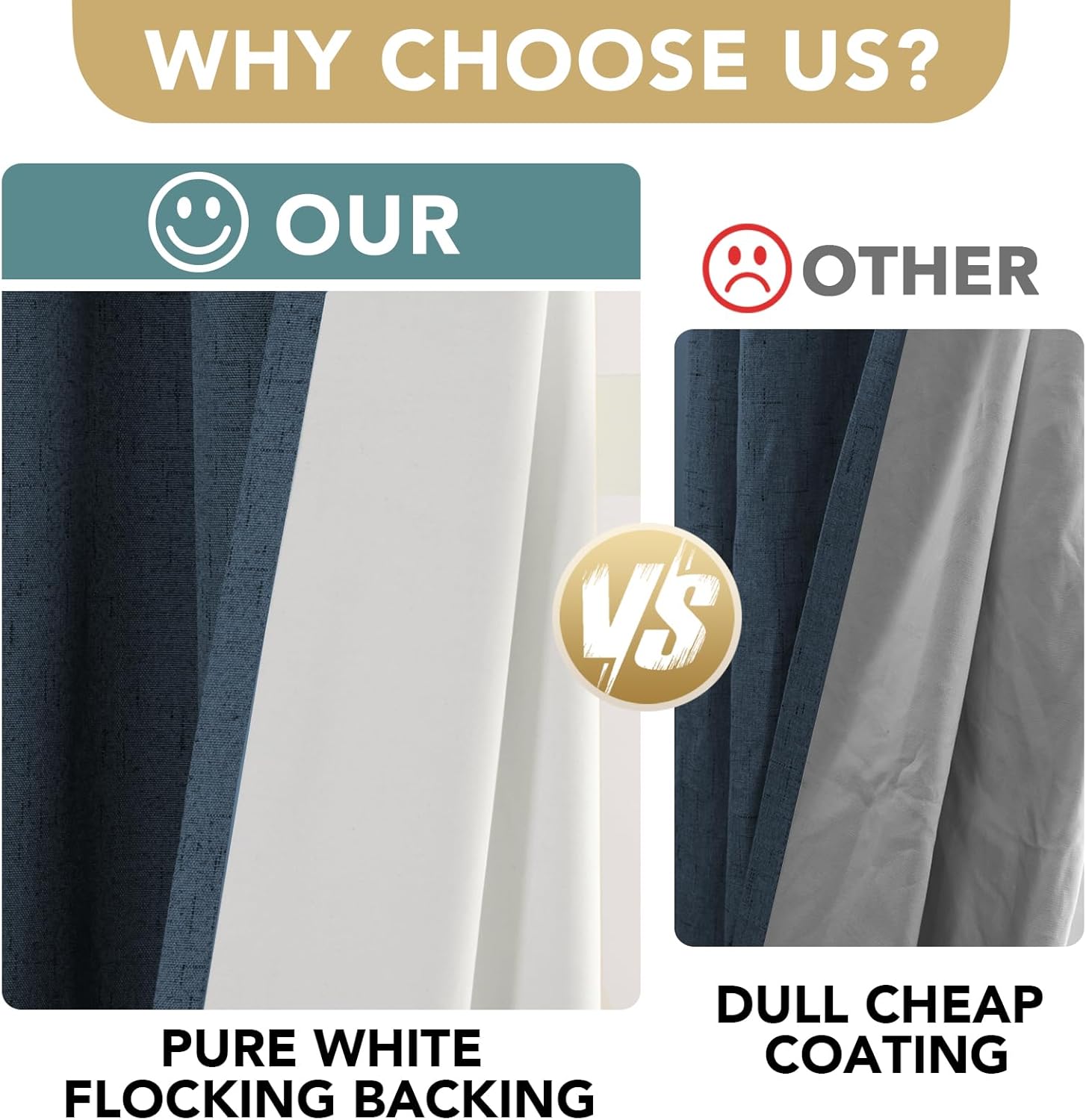 - INNOVATED MATERIAL: These casual linen draperies are crafted from rich linen like fabric (100% polyester), added with 100% blackout lining, draped and soft, block the wind and reduce the noise. Lab test shows these awesome curtain panels are environmental and vinyl free