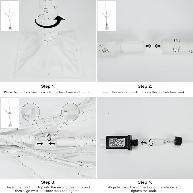 - Easy to install-- take out the tree stand, place the tree trunk into the tree and tighten, insert the tree trunk top into the tree trunk bottom and tighten. Convenient to move and can be reused. Super long power cord: 23ft/7M.