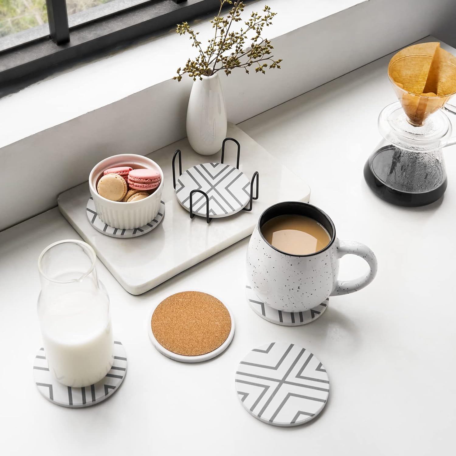 - Non-Slip: Stone coasters equipped with a cork backing to prevent slipping, it stays securely in place on any table. Unlike silicone, fabric, or other materials, the ceramic surface holds cups steady, ensuring stability for different types of drinks