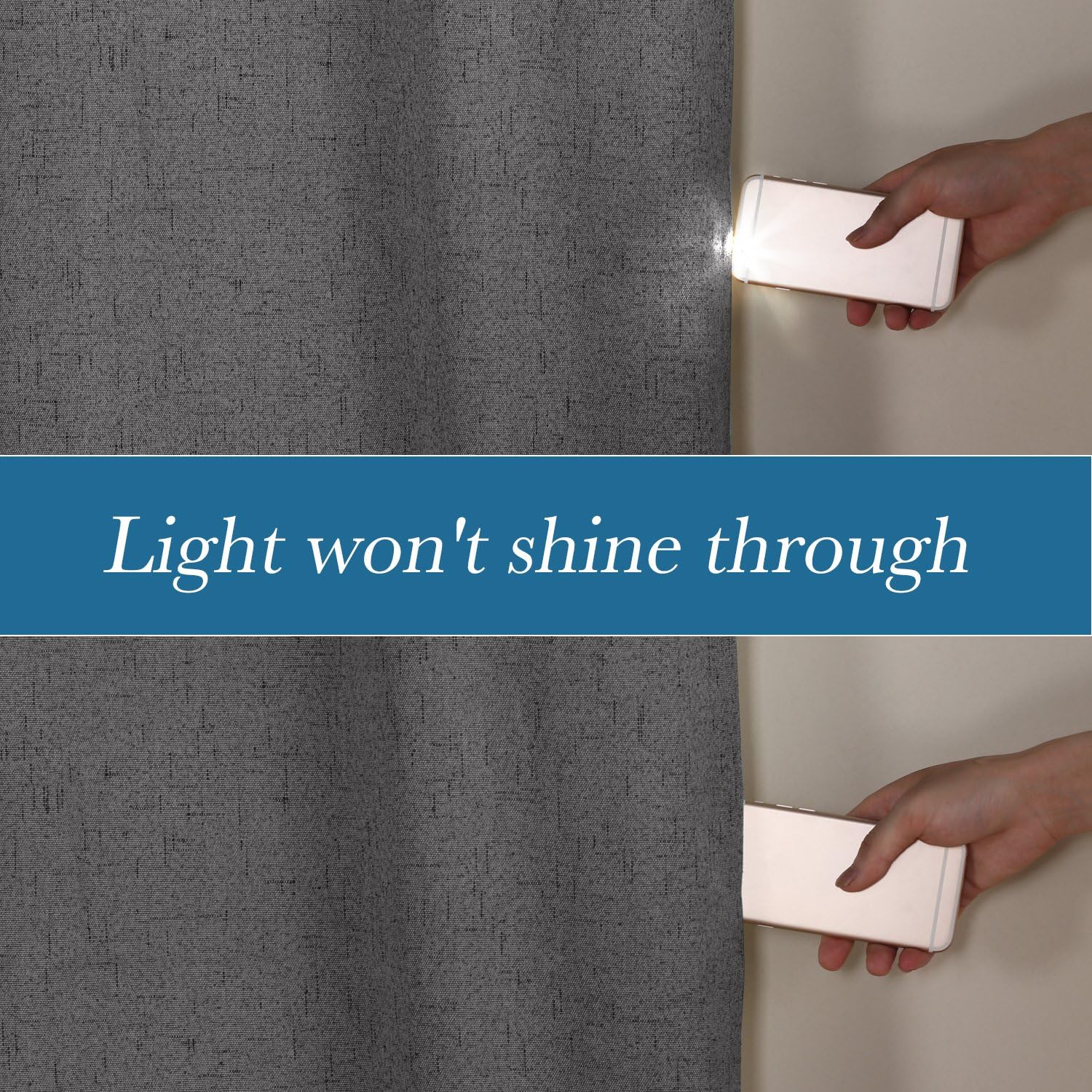 - 100% BLACKOUT: These elegant faux linen curtain is passed GLOBAL RECYCLED STANDARD certificate, has white color lining on backing, definitely can block out 100% bright sunlight and UV ray, turn day into night, just enjoy your sweet sleeping and protect your furniture from color fading, providing entire privacy in your place