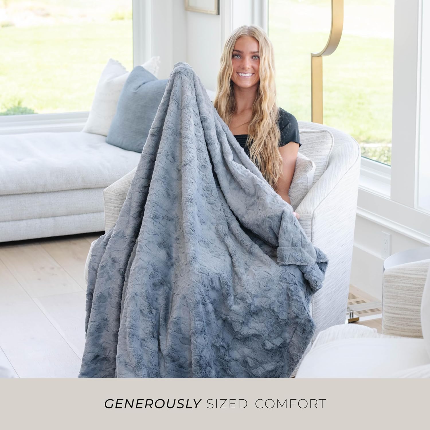 - LARGE COZY COMFORT: Measuring a generous 50" x 60", our throw blanket offers ample coverage for your bed or couch. Wrap yourself in its sumptuously soft faux fur, enjoying both comfort and style in one luxurious package.