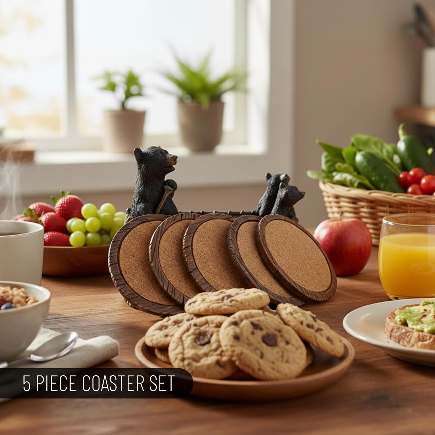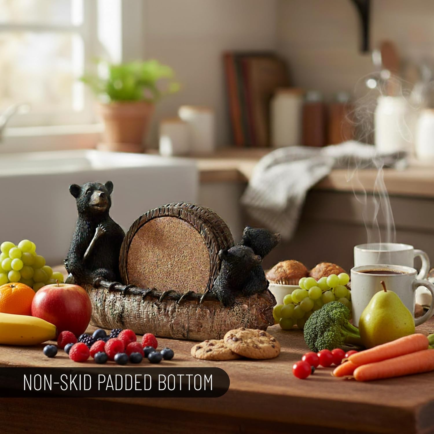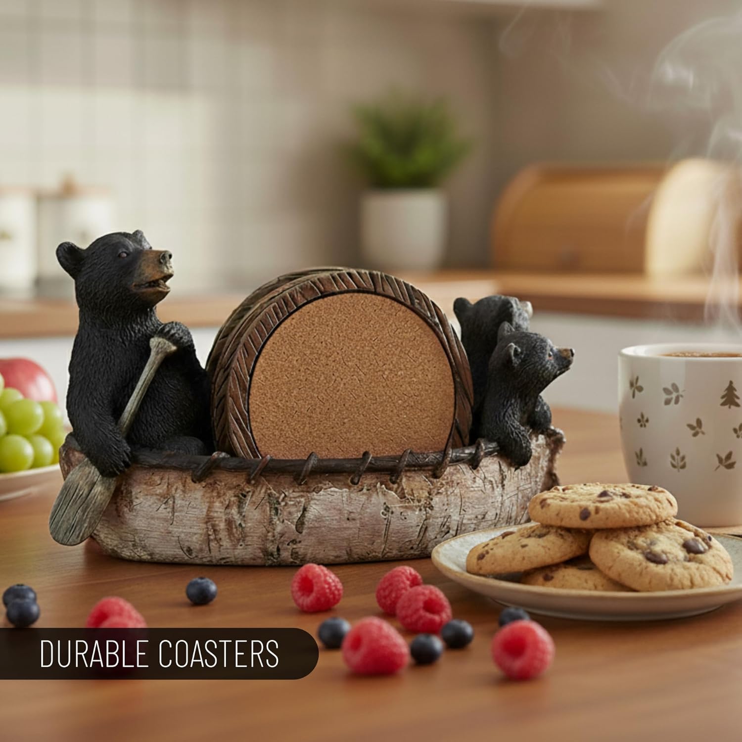 - ⭐ RELAX and HAVE A DRINK WITHOUT MESS OR DAMAGE: Use this Bear Coaster to prevent drips, puddles, damage and water stains! Share fun stories and moments over a coffee or drink on top of this black bear decor cub wildlife coasters rustic home decor bear. Consists of 5 black bear theme designed drinking coasters with bear canoe coasters holder.