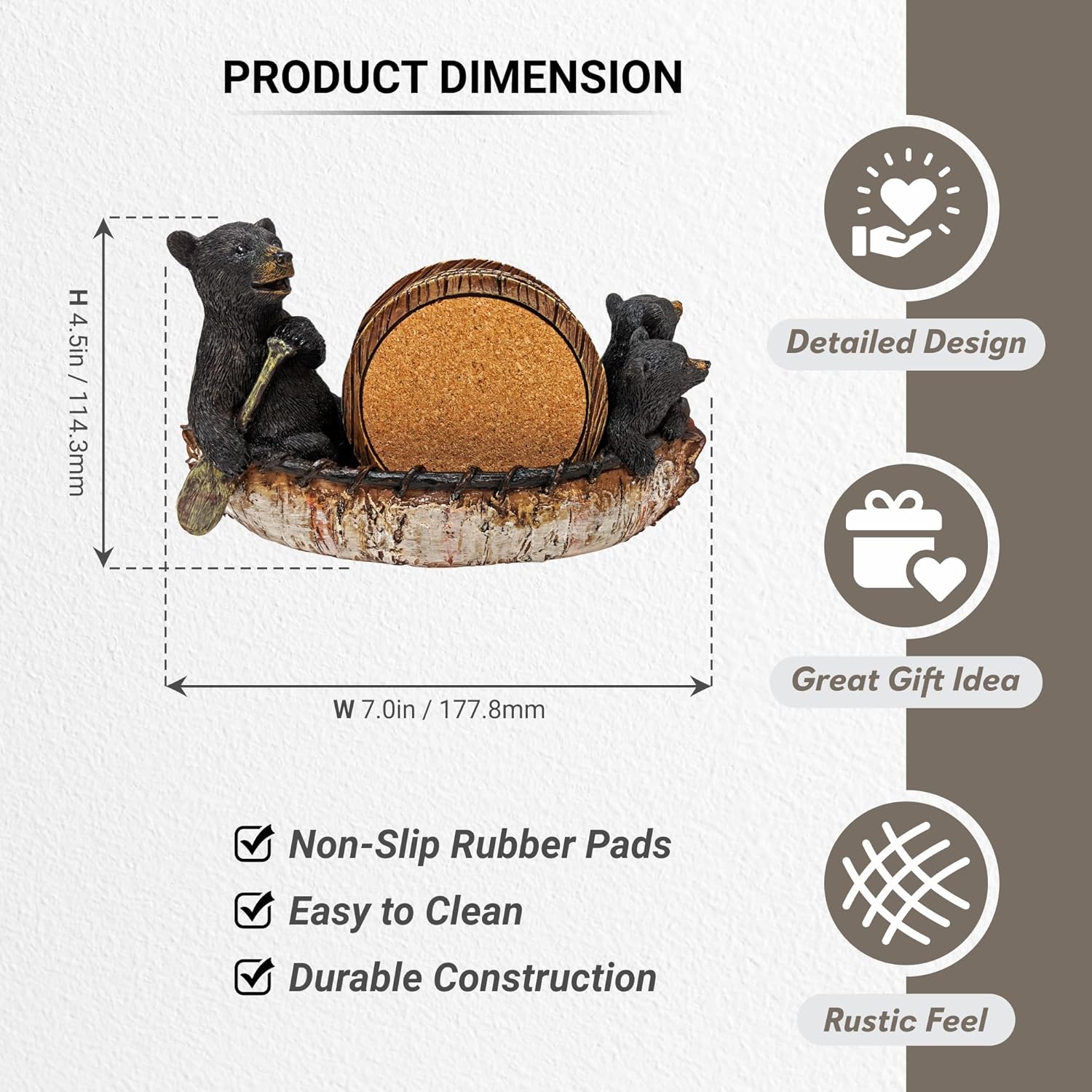 - ⭐ PRACTICAL & EASY TO CLEAN: This black bear rustic bear coaster set for drinks are made of polyresin material, hand painted and polished individually. Each bear vintage drink coasters and canoe holder individually comes with its own set of 5 rubber bear coaster set bumpers to help keep the cabin coasters from scratching the surface of your furniture.