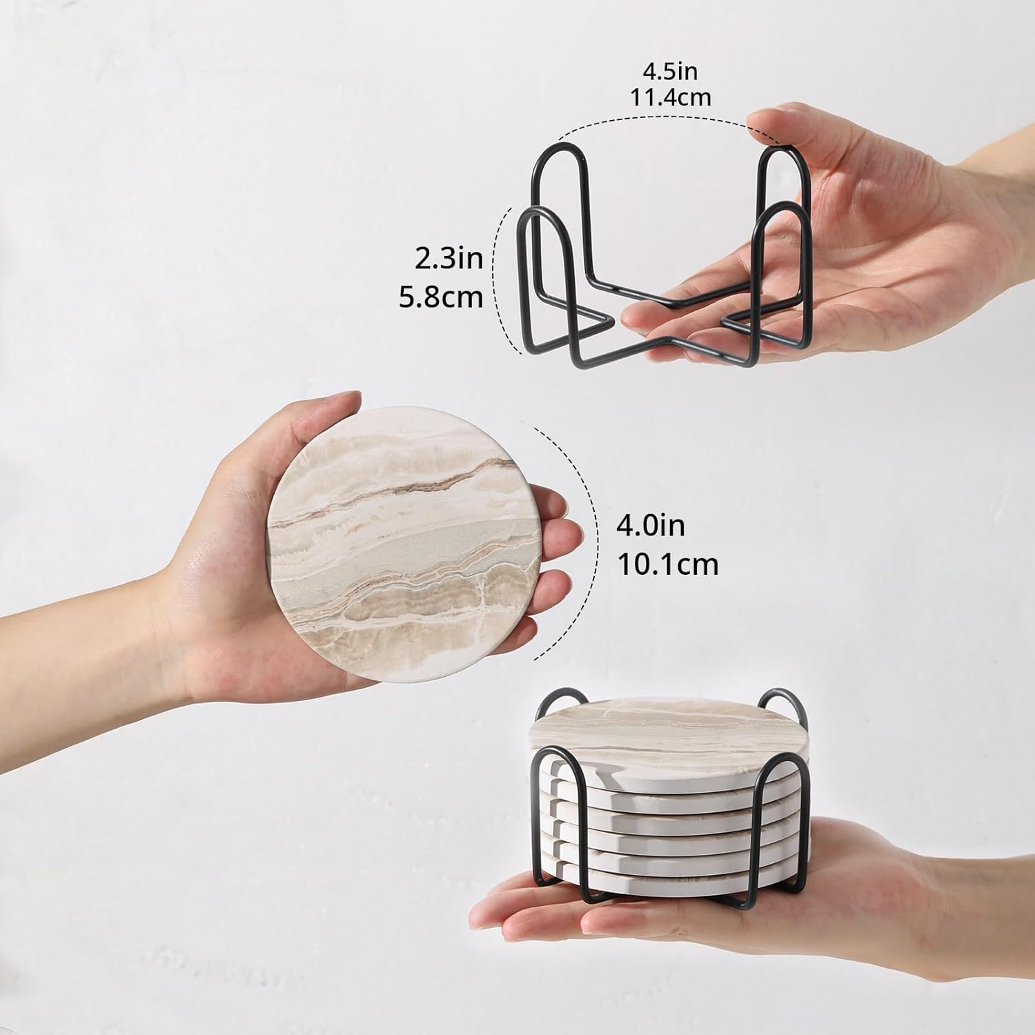 - Perfect Size: Coasters set of 6 with a 4-inch diameter and 0.27-inch thickness, these drink coasters with holder fit a wide variety of cups and glasses, providing ample space to catch drips and condensation, making it versatile for normal drinkware