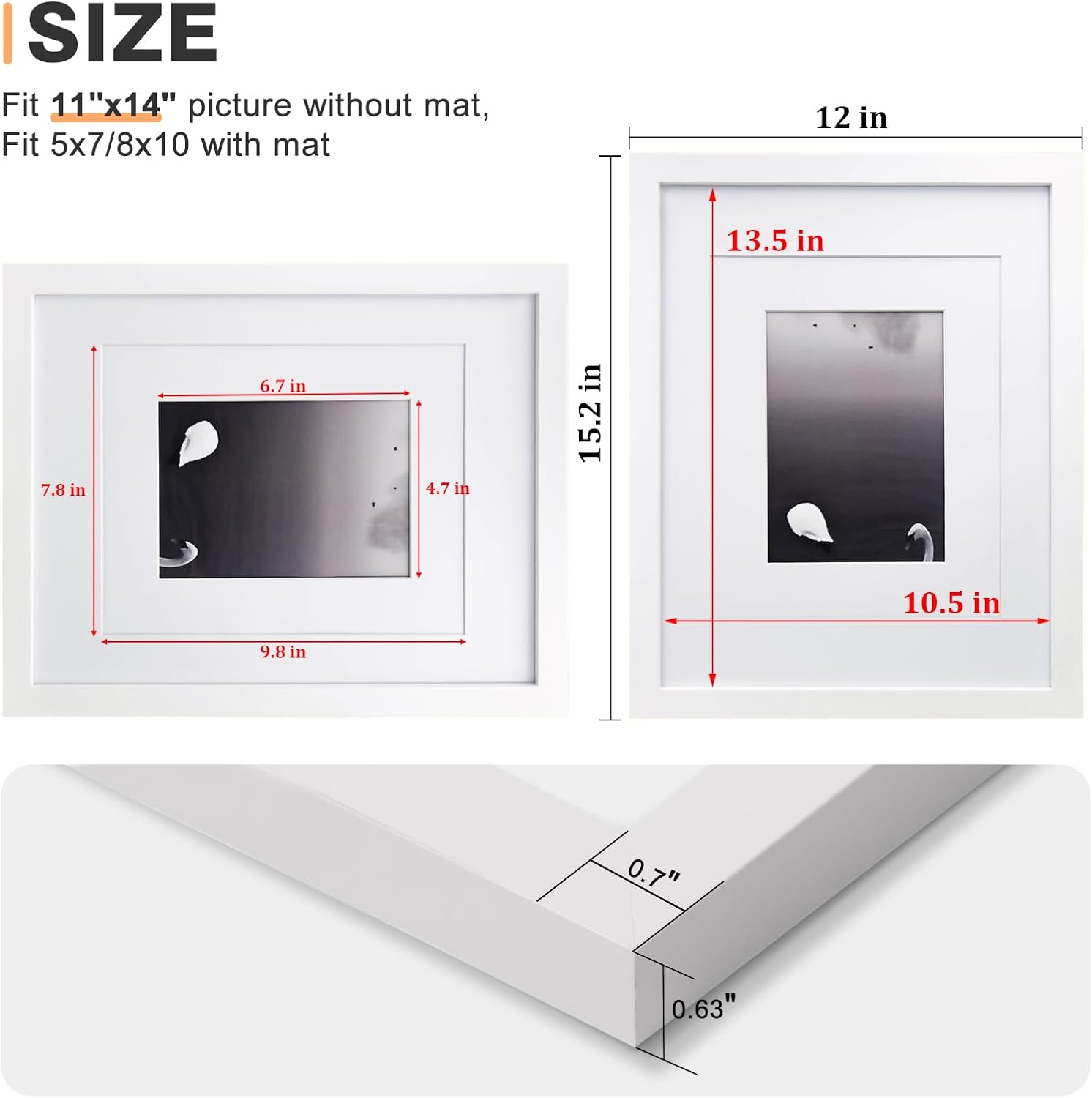- 3 SIZES PHOTOS DISPLAY: Our 11x14 photo frame come with two size of mats. Ideal decor white picture frames for 11x14 picture or print, also for 8x10 or 5x7 picture with mat. Note the opening view of each mat is 4.8x6.8 and 7.8x9.8