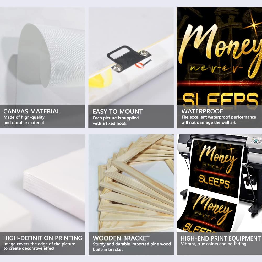 Large Size Money Never Sleeps Motivational Framed Wall Art Canvas Paintings Black and White Golden Artwork Stretched and Framed Easy to Hang-28x44 inch
