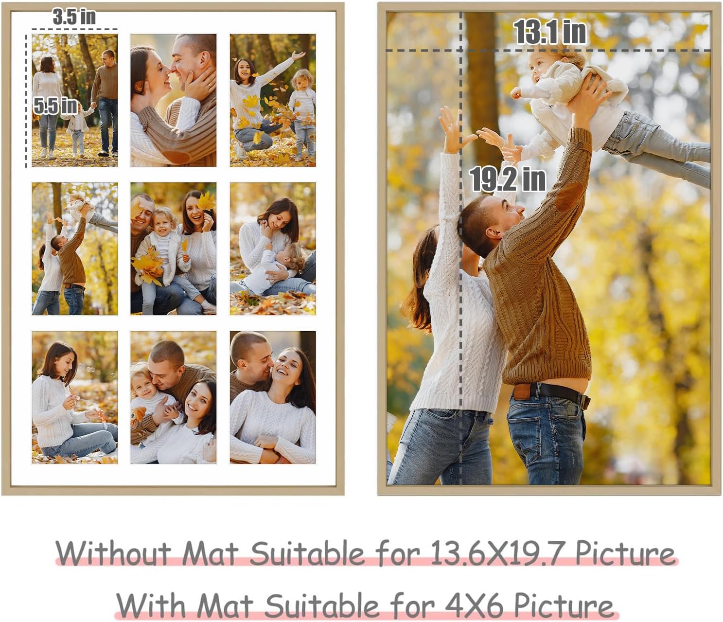 - Use and Display: Perfect for 9 4x6 inch pictures with mat or one 13.6x19.7 inch panorama artwork without mat; The actual mat openings are 3.5x5.5 inches; We recommend taping the 4x6 inch photos to the back of the mat to keep the photos to be displayed