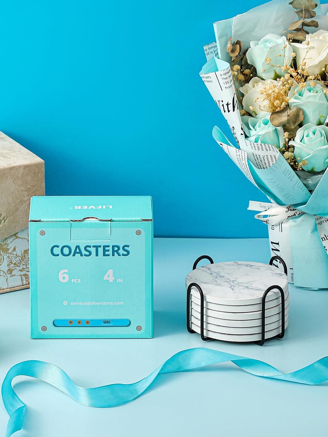 LIFVER Coasters for Drinks, White Marble-Style Absorbent Coasters with Holder, Housewarming Gifts for Home Decor, Suitable for Kinds of Cups, 4 Inches, Set of 6