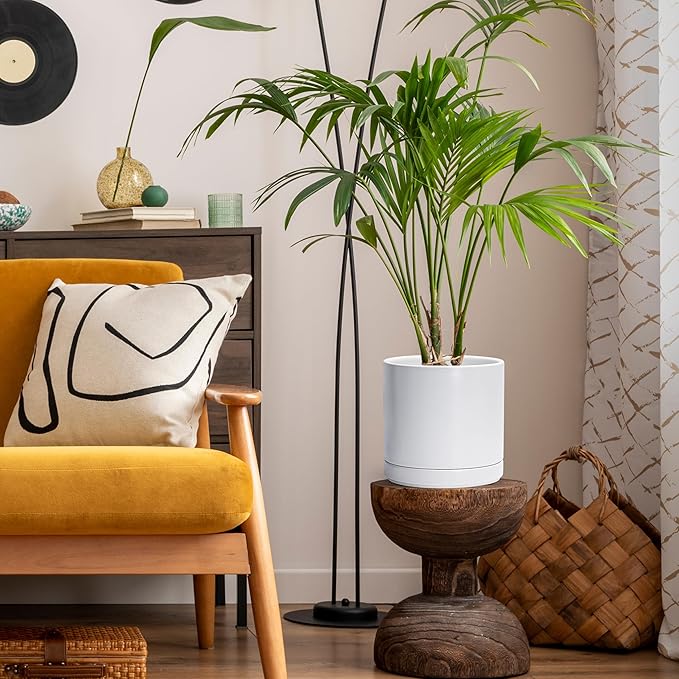 D'vine Dev 8.2 Inch Ceramic Planter Pot with Drainage Hole and Saucer, Indoor Cylinder Round Planter Pot, White, 94-O-D-1