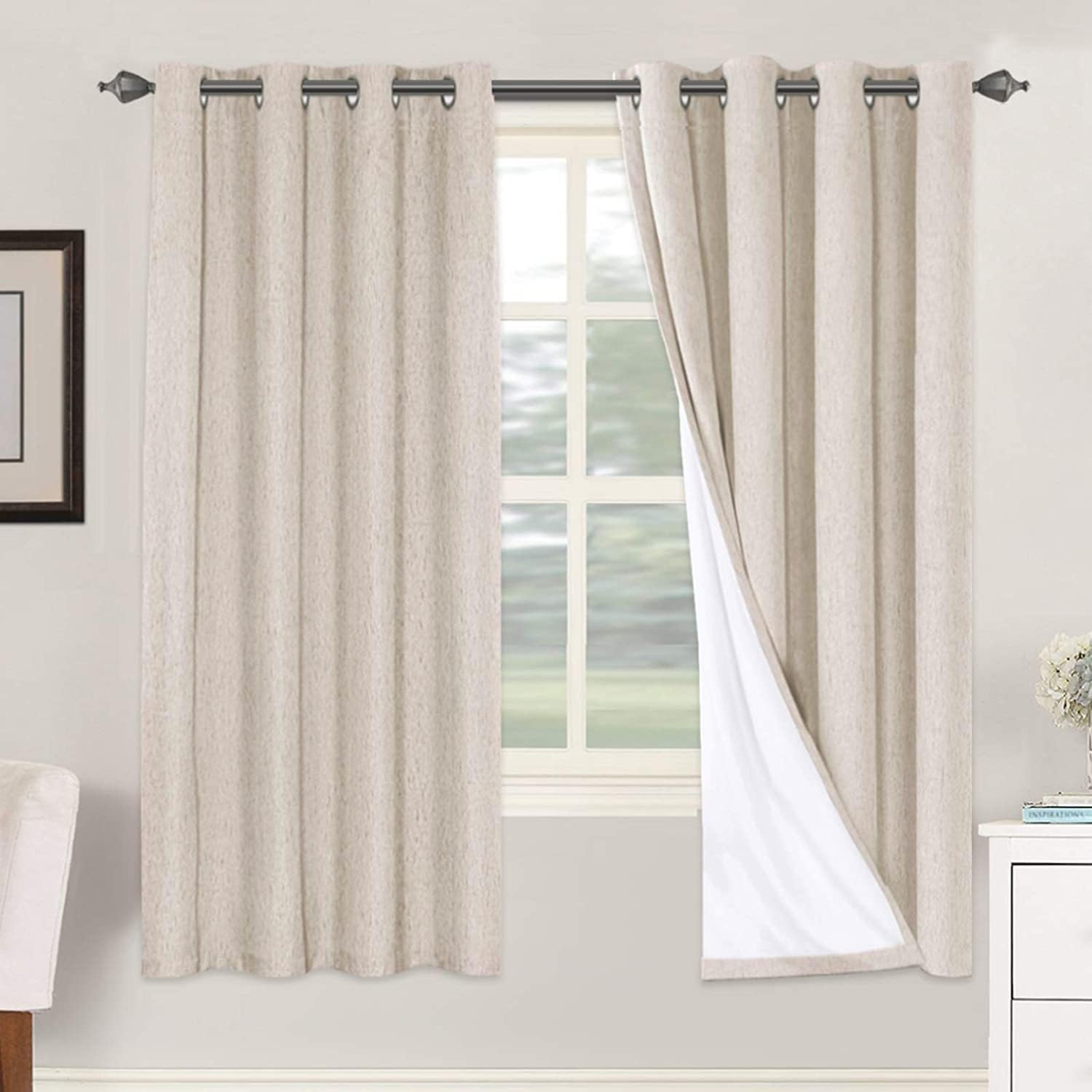 - 100% BLACKOUT: These elegant faux linen curtain is passed GLOBAL RECYCLED STANDARD certificate, has white color lining on backing, definitely can block out 100% bright sunlight and UV ray, turn day into night, just enjoy your sweet sleeping and protect your furniture from color fading, providing entire privacy in your place