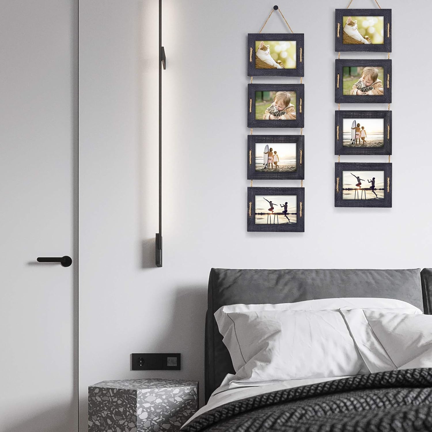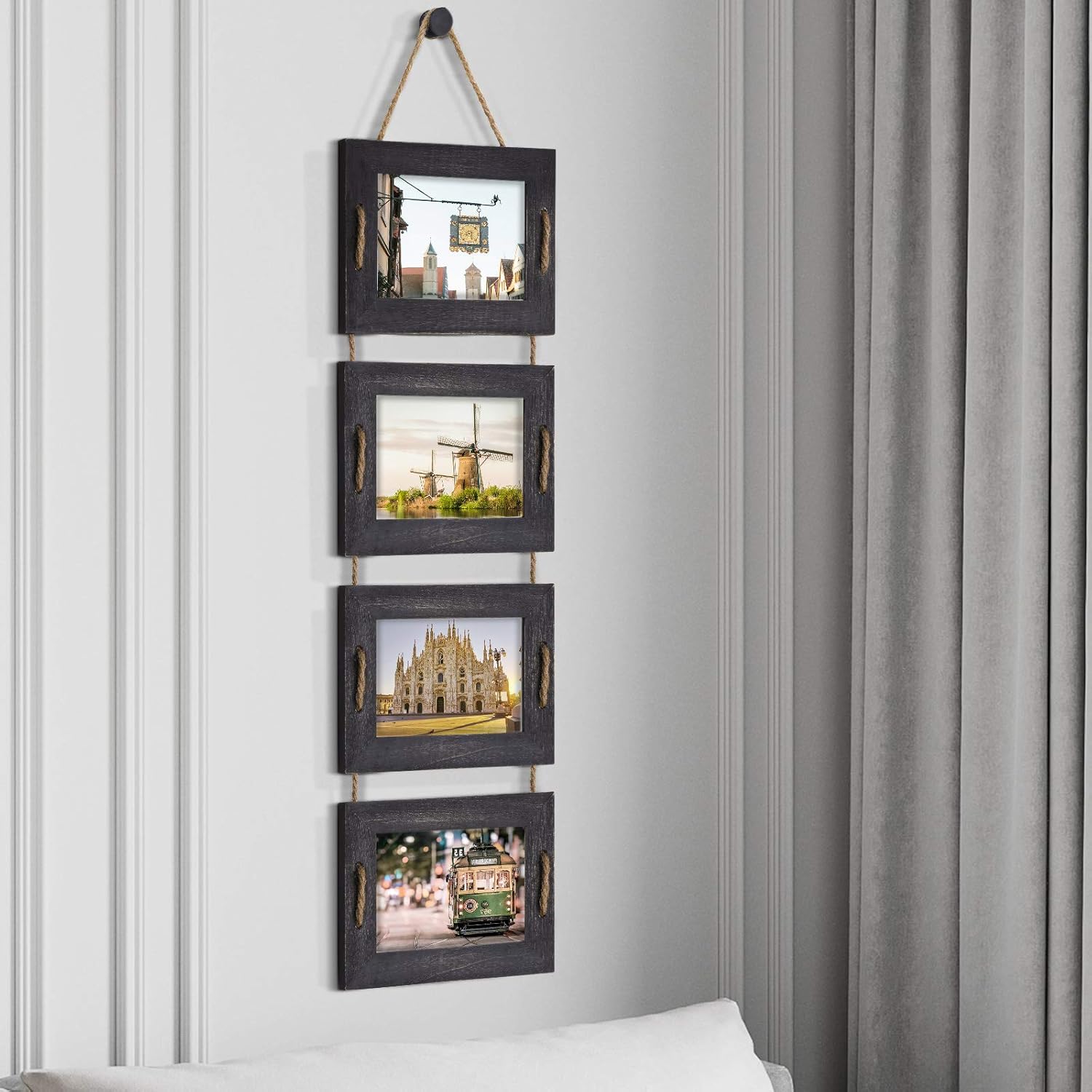 DLQuarts 5x7 Hanging Collage Picture Frames Wall Decor, 4-Opening 5x7 Matted to 3.5x5 Photo Rustic Wood Frame with Hemp Rope, 2 Pack, Weathered Black