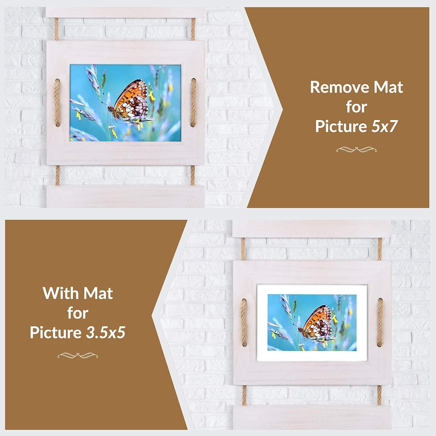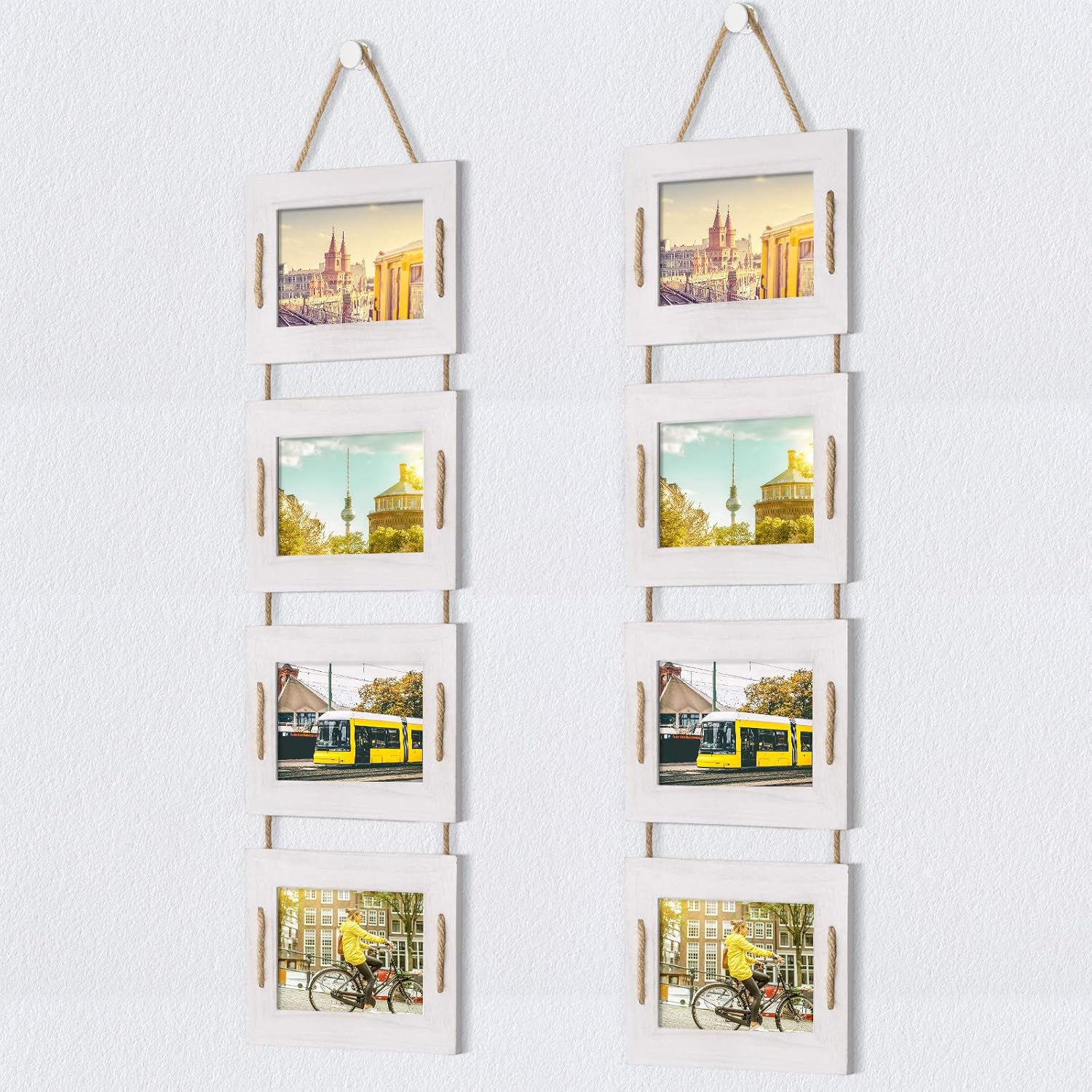 DLQuarts 5x7 Hanging Collage Picture Frames Wall Decor, 4-Opening 5x7 Matted to 3.5x5 Photo Rustic Wood Frame with Hemp Rope, 2 Pack, Vintage White