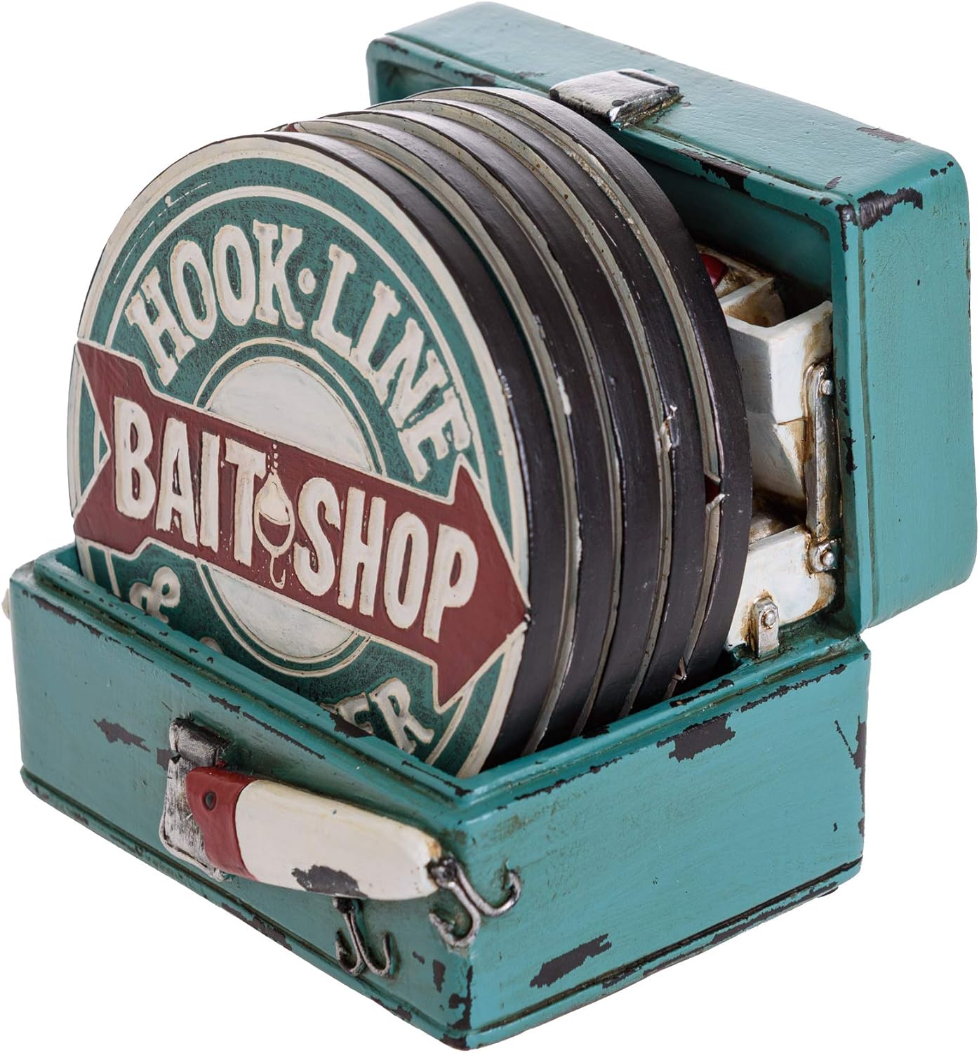 Hook Line & Sinker Bait Shop Rustic Drink Coasters with Holder - Set of 5