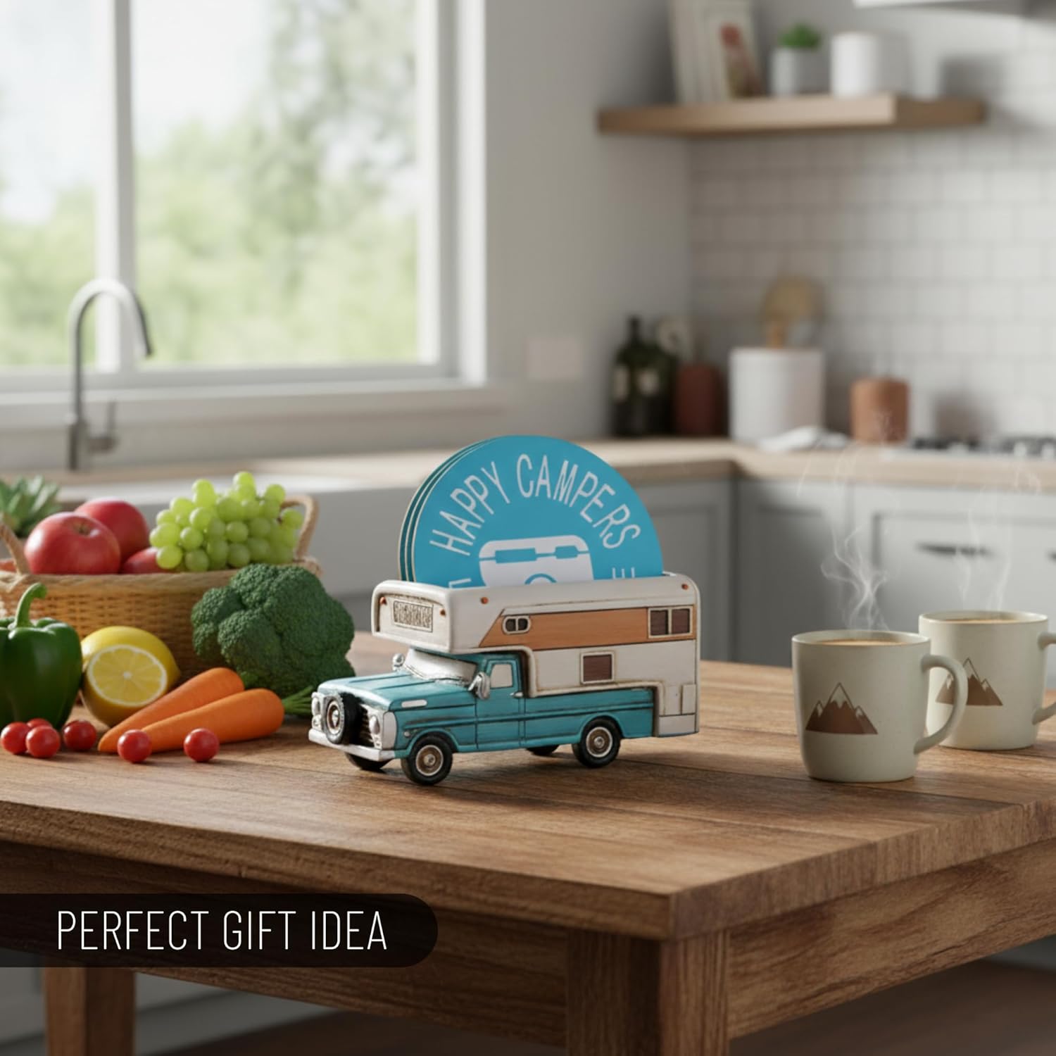 - HAPPY CAMPERS SET OF 5 COASTERS: Each 5 piece set of round home camper coasters includes an RV truck coaster holder that keeps them well organized. Keep them organized & ready to be used for happy hour.