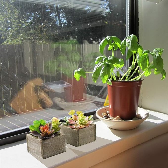 - [Realistic Modern Design] Faux succulents in pots with vivid color and exquisite workmanship for a realistic look and give you a realistic feel when you touch them. They are the perfect simple greenery to liven up any space with the wooden potted decor plants.