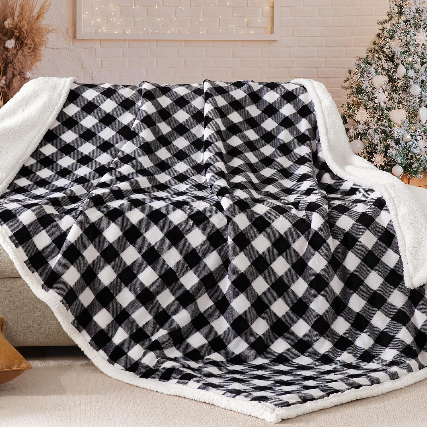 BEAUTEX Sherpa Fleece Flannel Throw Blanket, Super Soft Warm Buffalo Plaid Plush Blankets and Throws, Lightweight Cozy Fuzzy Blanket for Couch Sofa Bed (Black, Throw 50" x 60")