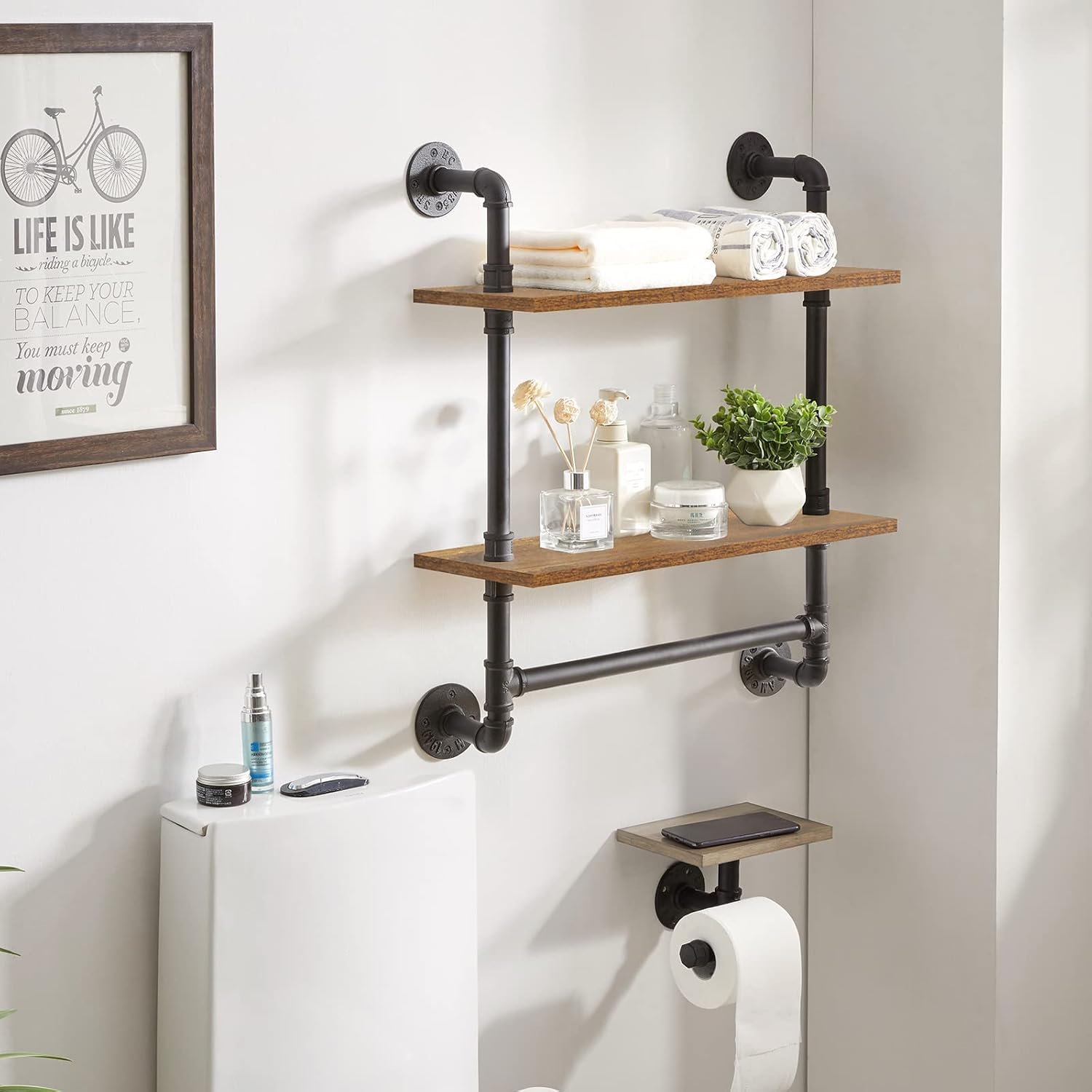 - Sturdy Rustic Pipe Shelf: This floating rack is made of strong metal tubes and thick particleboard and can hold up to 50 pounds per layer. There are towel bar under the ledges to hang family towels.