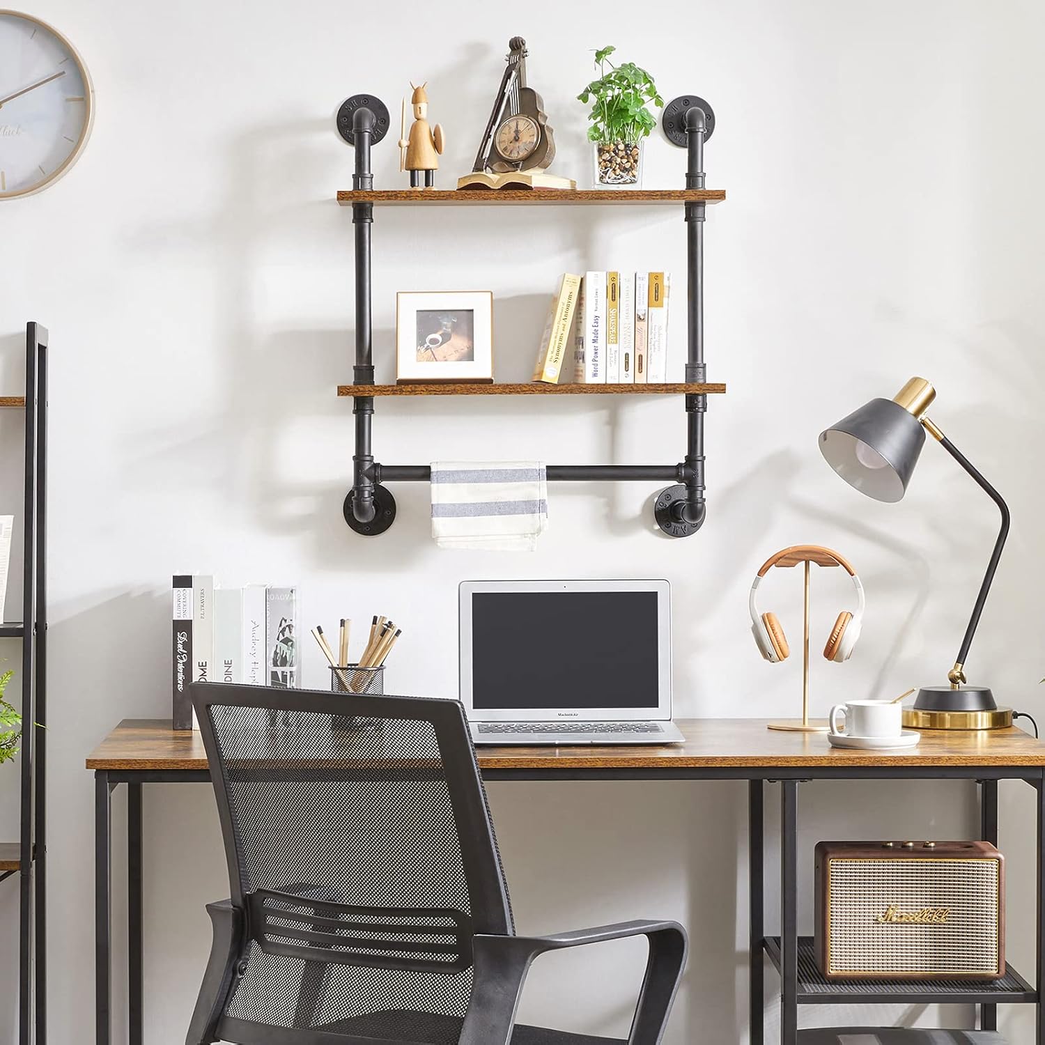 - Artist of the Wall: The rustic panels and sturdy plumbing make this floating rack a stunning sight. The two-layer shelves and towel bar at the bottom keep everything you need handy. Its versatile style suits most home decor.