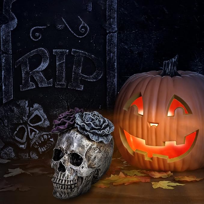 WENYLE Halloween Skull Statues Home Decor Day of Dead Purple Grey Rose Silver Skull Resin Figurine Flower Skull Decor 7.25" L