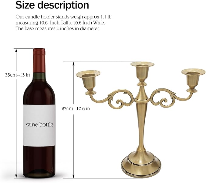 - 【 Premium Metal Construction 】 – We at Viscacha have constructed premium metal candelabras for more than 15 years. Our company uses state of the art metal plating technology to provide different candelabra colors for your selection. Our candle holder stands weigh approx. 0.9 lb, measuring 10.6 Inch Tall x 10.6 Inch Wide. The base measures 4 inches in diameter.