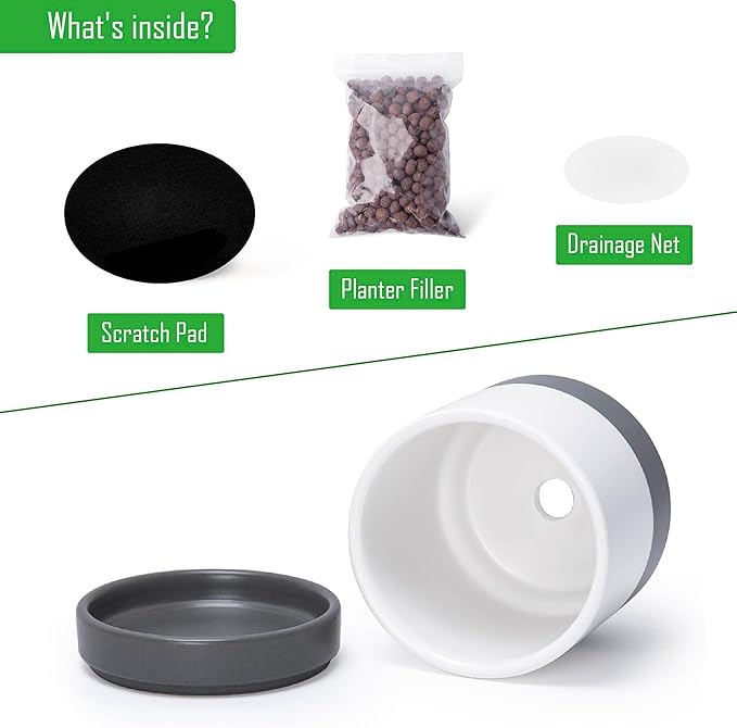 - Planter pot with drainage hole, mesh drainage net and protective scratch pad included.