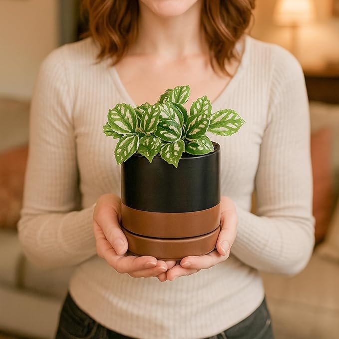 D'vine Dev 4.7 Inch Ceramic Planter Pot with Drainage Hole and Saucer, Indoor Cylinder Round Planter Pot, Black/Speckled Tan, 94-O-B-7