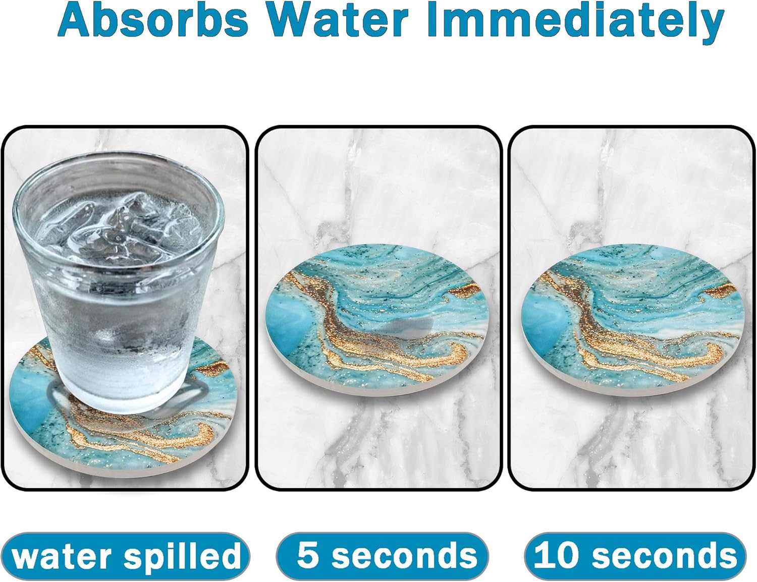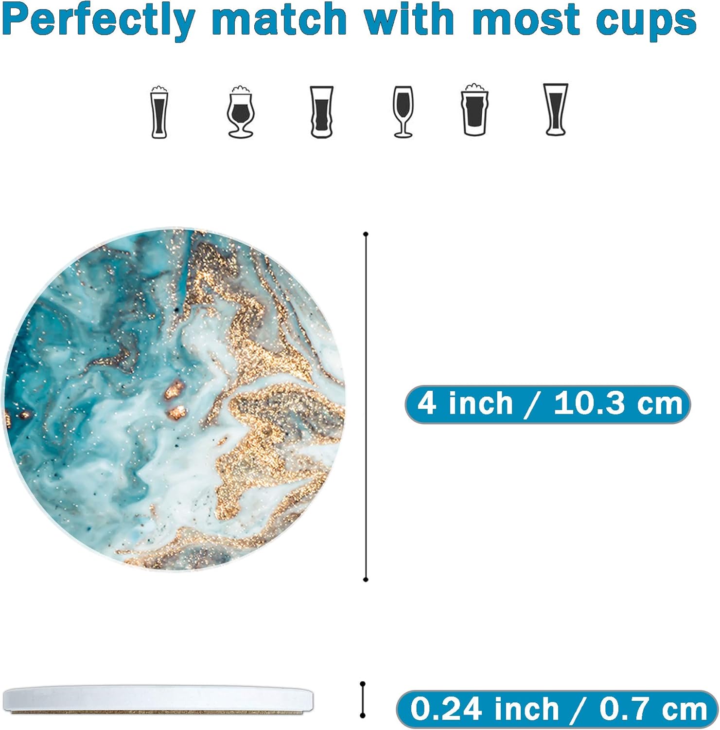 Dooke Coasters for Drinks, Round Absorbent Ceramic Stone Coasters Set of 6 with Cork Base,Funny Coaster with Holder for Cold Drinks Wine Mugs and Cups Tabletop Protection, 4 Inches,Teal Marble