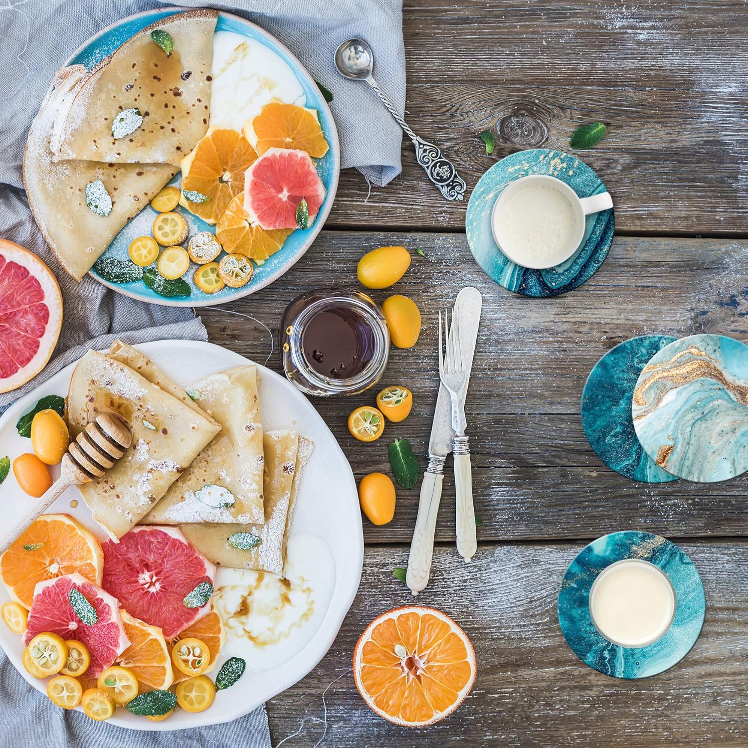 - CLASSICAL DECORATION : The cute coasters set with classic round pie-shaped, frosted edge design is a perfect decoration for all kinds occasions like coffee bar, living room, farmhouse, rustic kitchen, cool room, apartment decor. Front of the coaster adopts a simulation printing process, which has a slight stone touch, great as house warming presents for new home, coffee accessories, table decor, lake house decor.