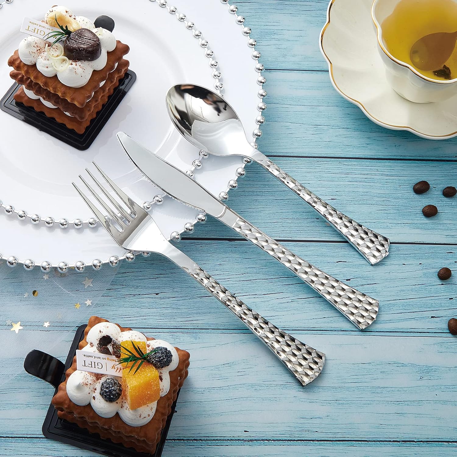 - All-Inclusive Package: With 15 dinner plates (10.25"), 15 dessert plates (7.5"), 15 silver plastic forks, 15 spoons, and 15 knives, this set provides everything you need for a memorable party or wedding