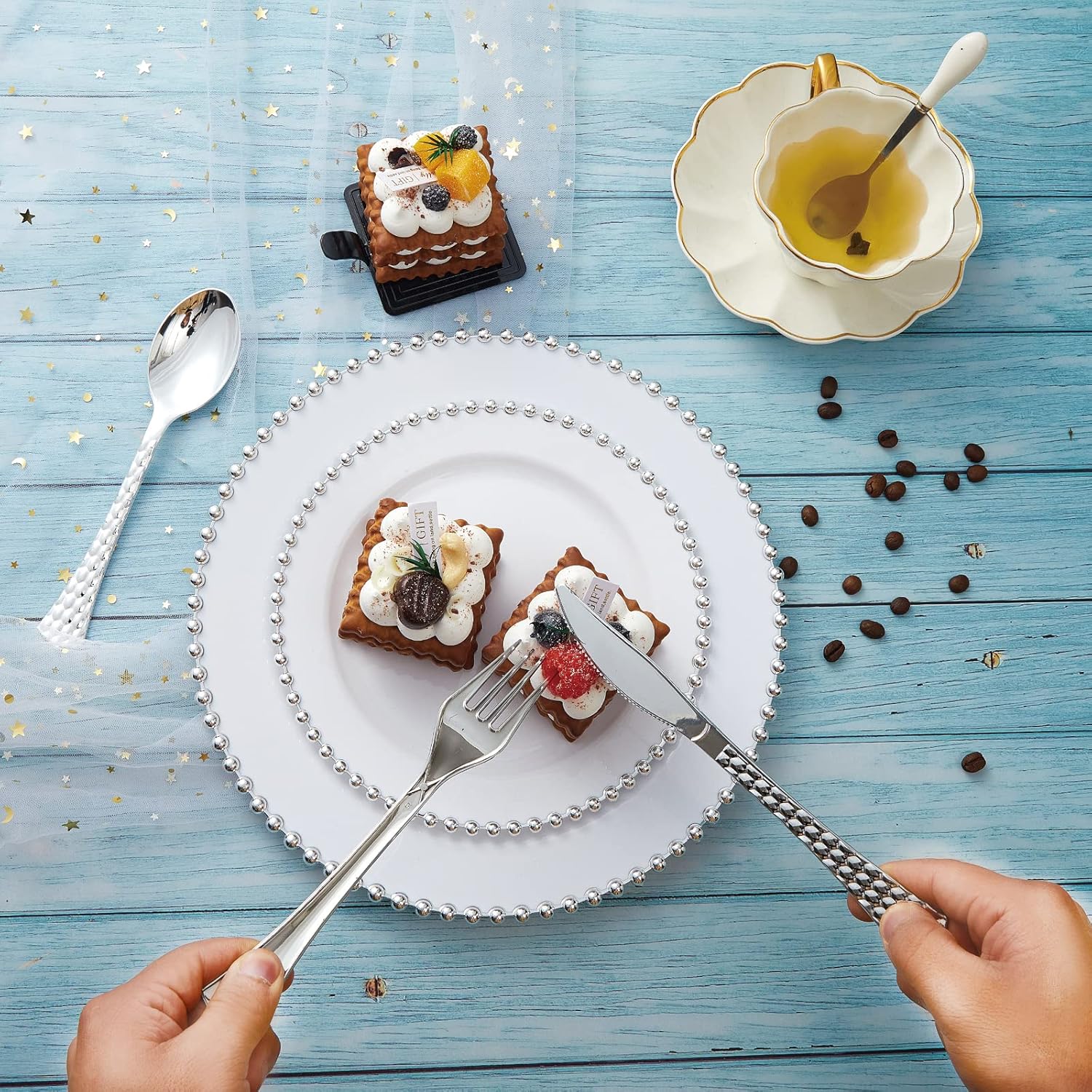 HOMIP 75Pcs Fancy Disposable Dinnerware Party Set, 15 Dinner Plates 15 Dessert Plates with Silver Bead Rimed, 15 Silver Spoons, 15 Knives, 15 Forks, Plastic Silverware for Wedding Birthday Party