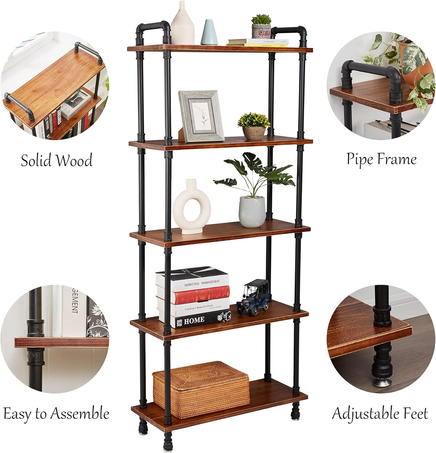 Industrial Bookshelf, 5 Shelf Bookcase, Rustic Brown Pipe Shelving (29.5" L x 11.8" W x 70" H)