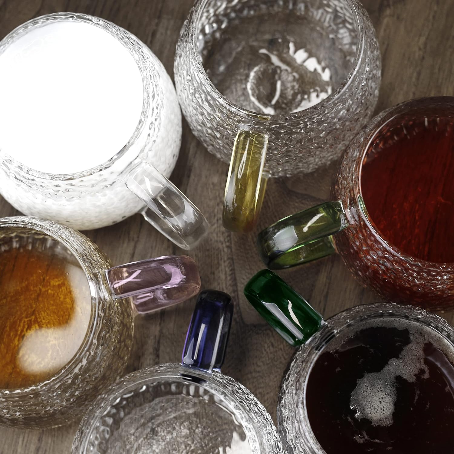 LUXU Hammered Tea Cups,Glass Coffee Mugs,Set of 6 Coffee Cups with Different Color Handles-15 oz,Prefect for Cappuccino,Latte,Water,Mocha,Milk,Widely Used for Cafes,Home and Office