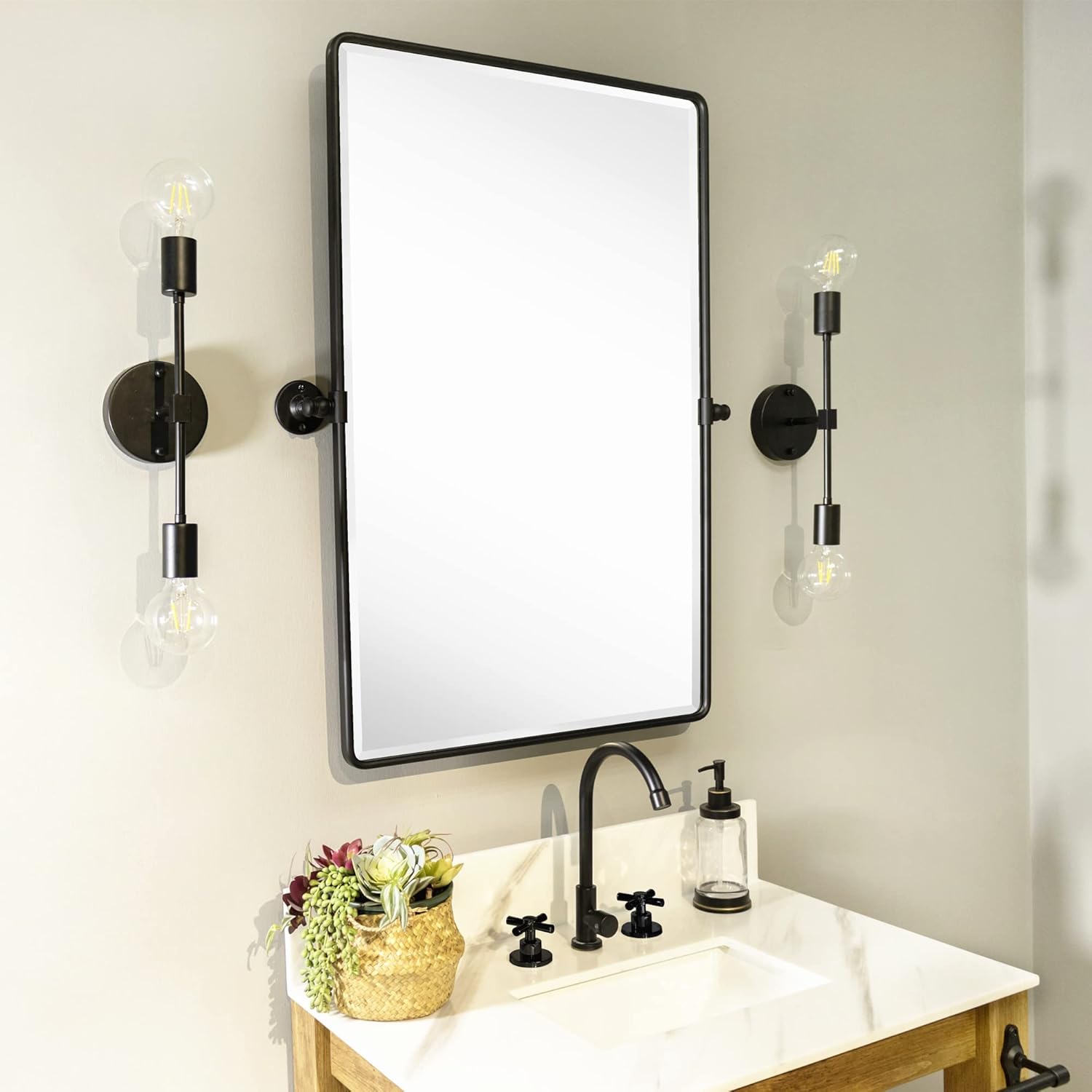 - Practical yet Beautiful Design: One of our best-selling pivot bathroom mirror collection! Framed in metal for unrivaeld strength. Tilting up or down to adjust viewing angle for either standing or seated mirror use. Also this pivoting mirror is coming with an elegant and generous 3/4'' bevel. An easy fit in your bathroom aesthetics no matter it's Chic Modern or Rustic Farmhouse.