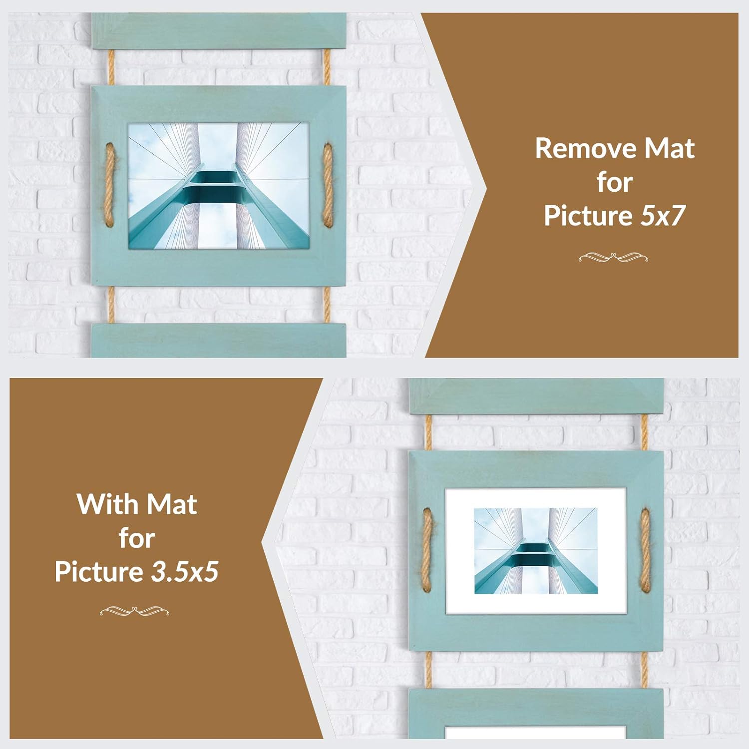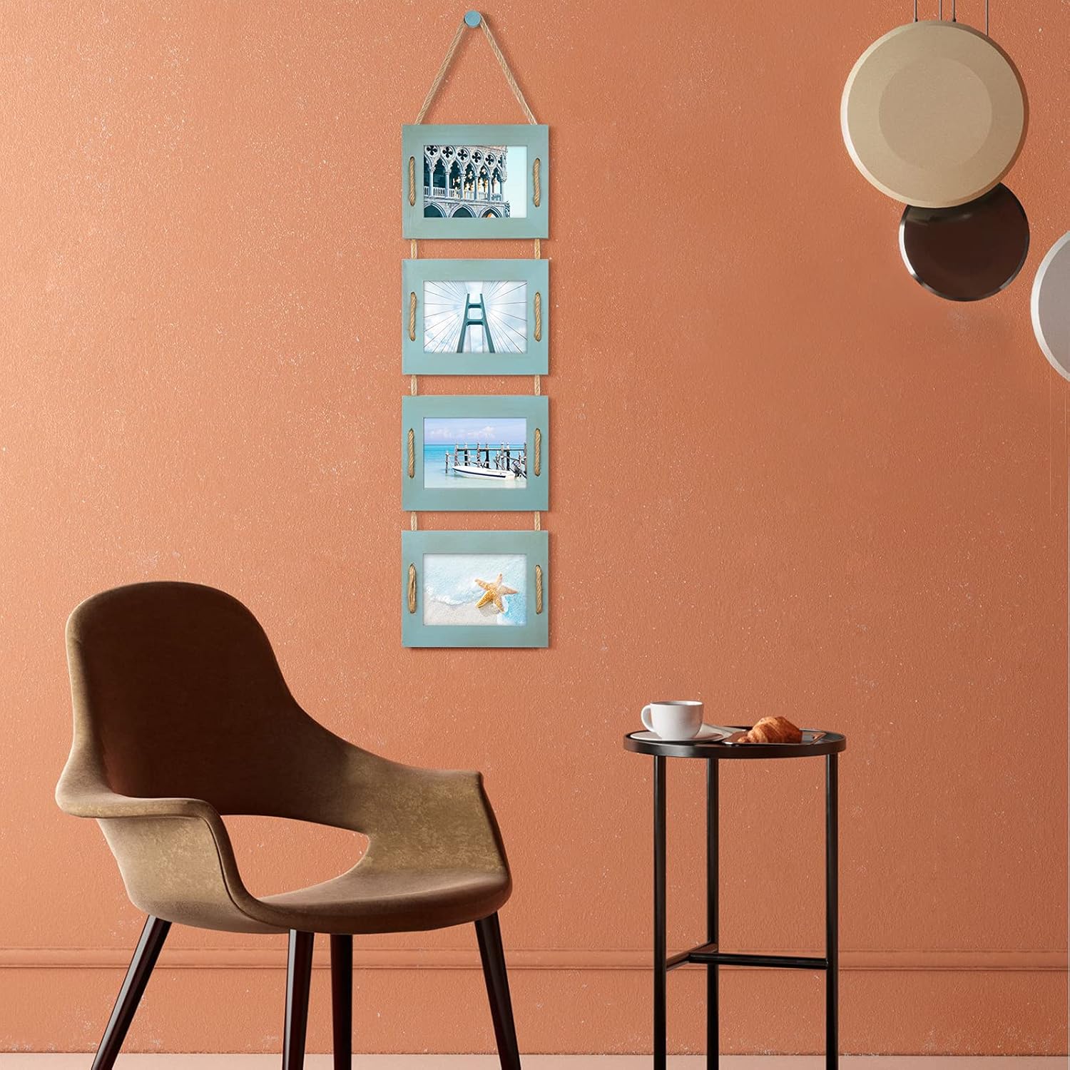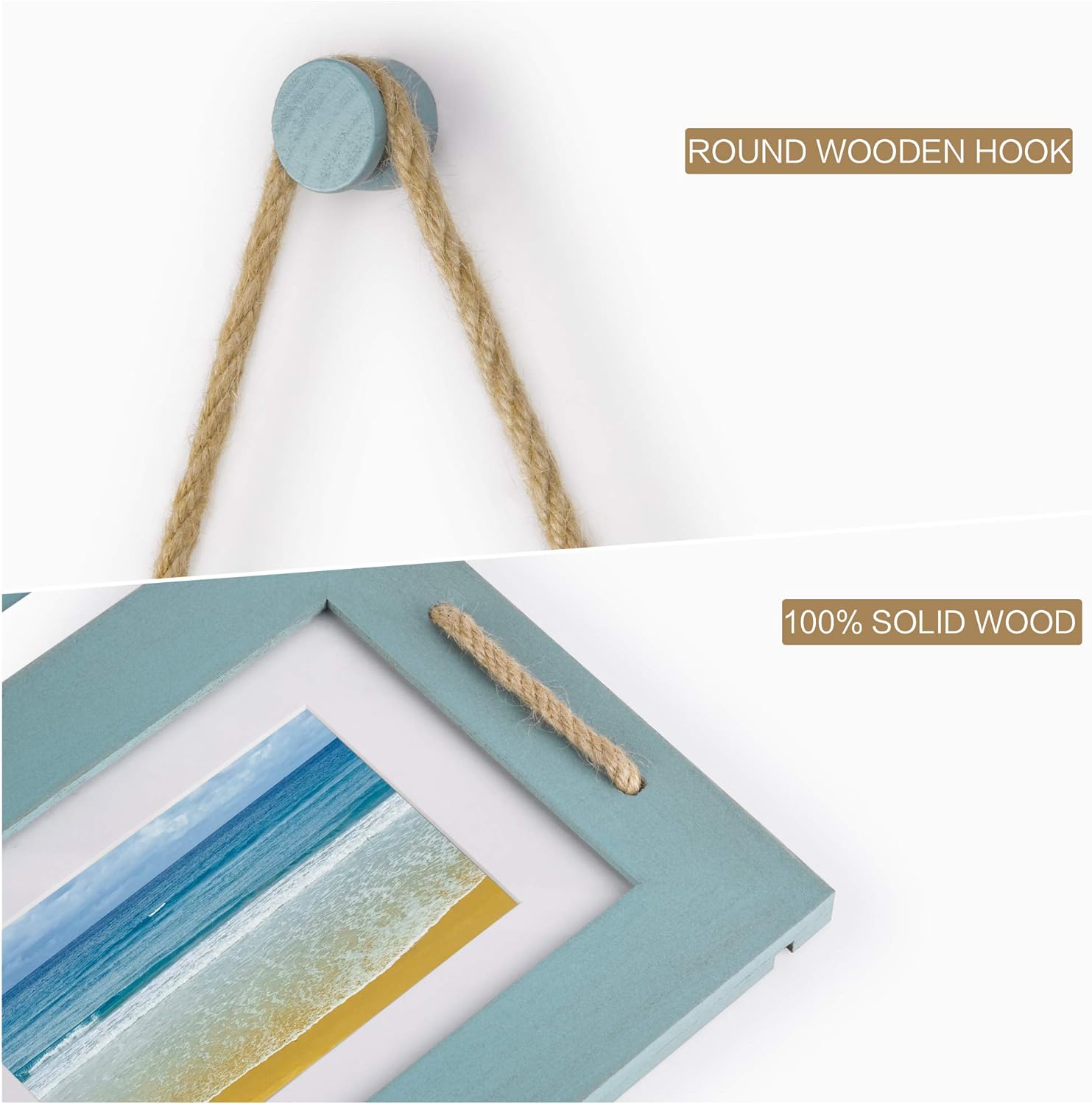 DLQuarts 5x7 Hanging Picture Frames Collage Wall Decor, 4-Opening 5x7 Matted to 3.5x5 Photo Rustic Wood Frame with Hemp Rope, 1 Pack, Ocean Blue