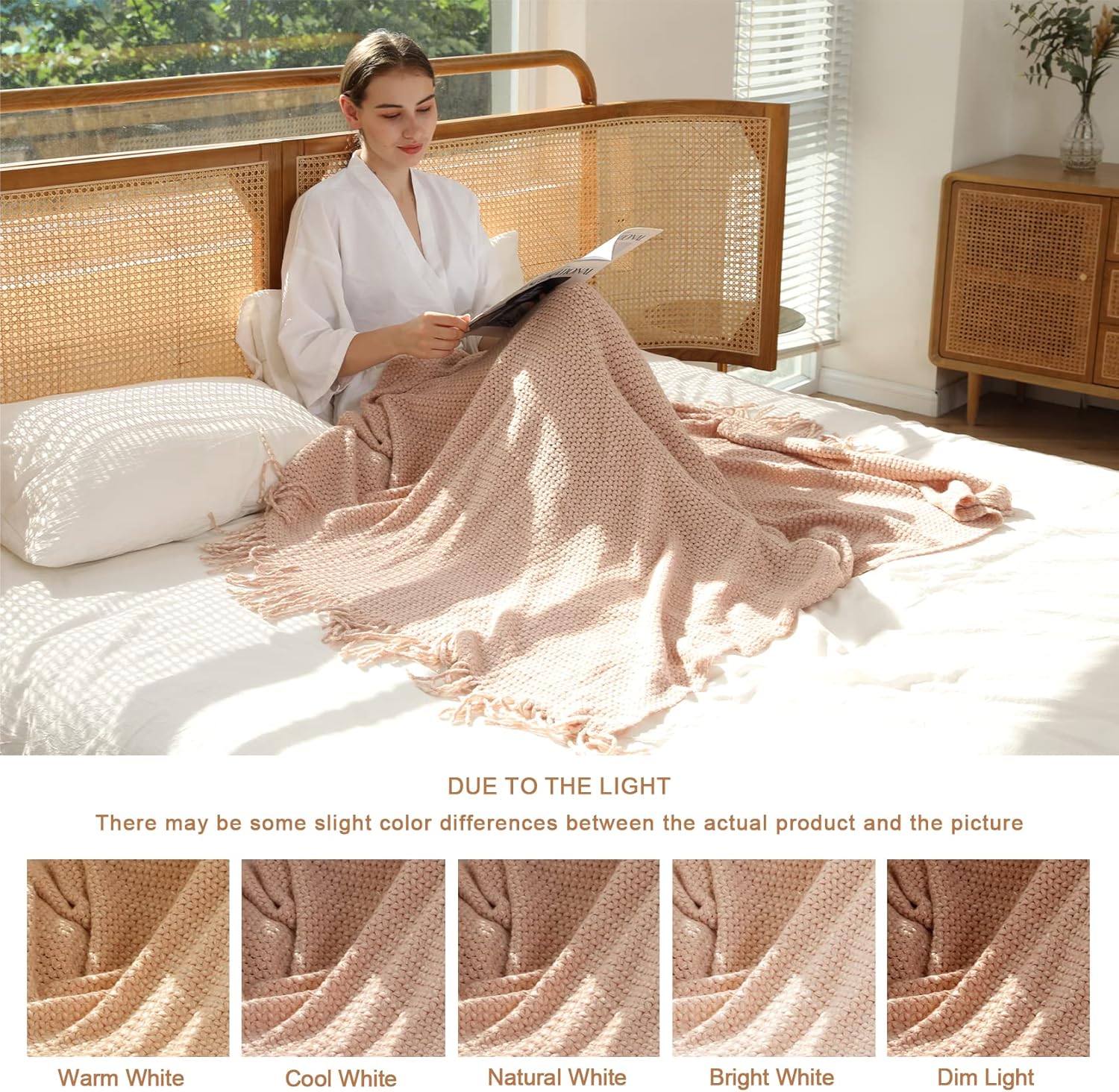 Blagic Knitted Throw Blanket for Couch,Soft Farmhouse Throw Blanket with Tassels,Home Decorative Lightweight Throw Blankets,Throws for Bed/Chair/Sofa,Wheat Textured (Light Pink & White,50" W x 60" L)