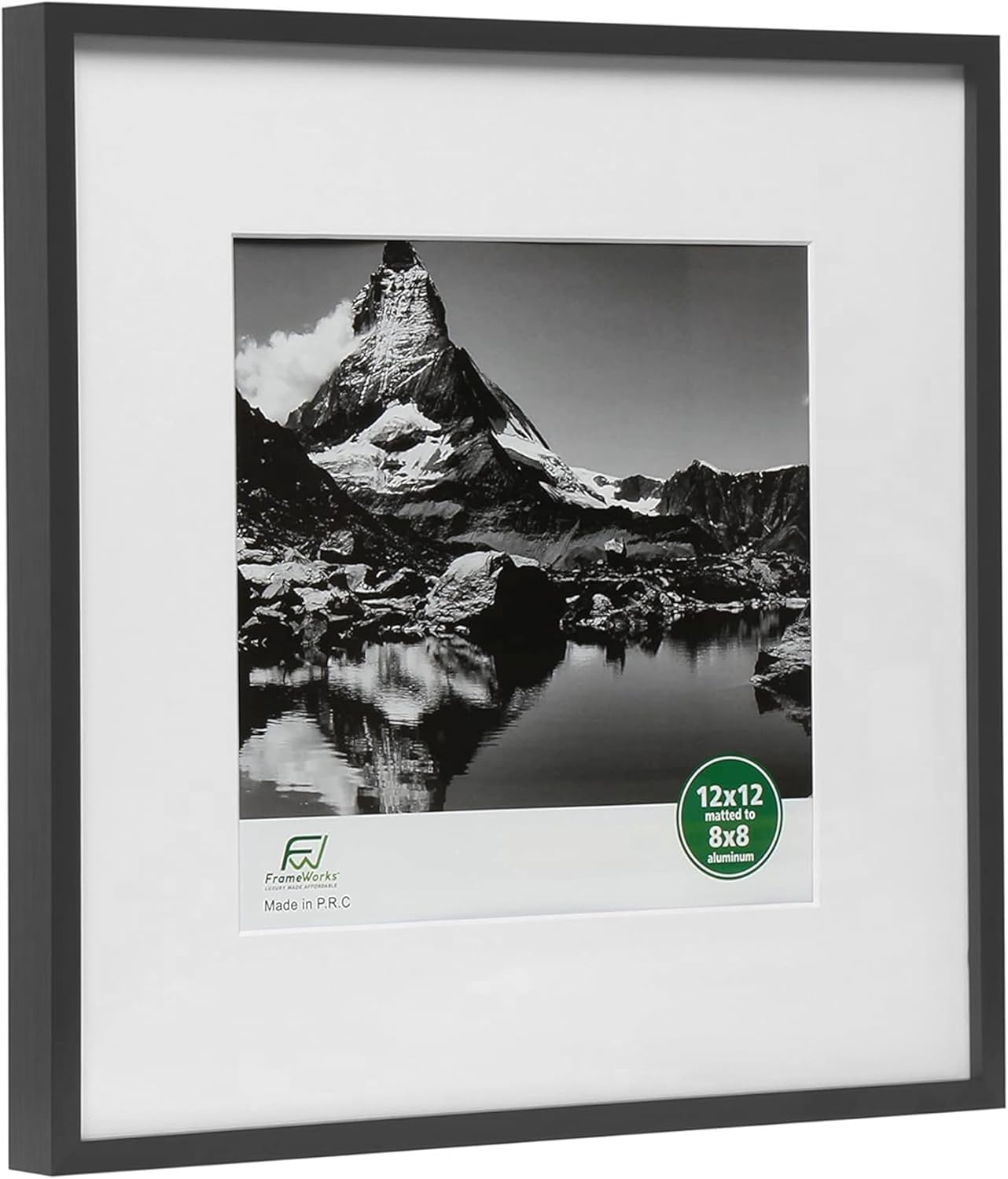 FrameWorks 12x12 Matted to 8x8 Picture Frame – Aluminum Frame w/Tempered Glass, Removable Mat for Photos, Posters, Art, Stylish Wall Frame for Home Decor, Gallery Walls, Office, Living Room - Black