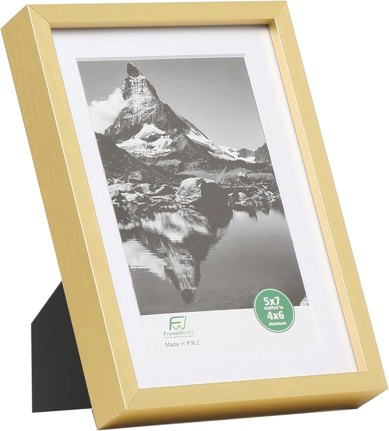 FrameWorks 5x7 Matted to 4x6 Picture Frame – Aluminum Frame w/Tempered Glass, Removable Mat for Photos, Posters, Art, Stylish Wall Frame for Home Decor, Gallery Walls, Office, Living Room - Gold