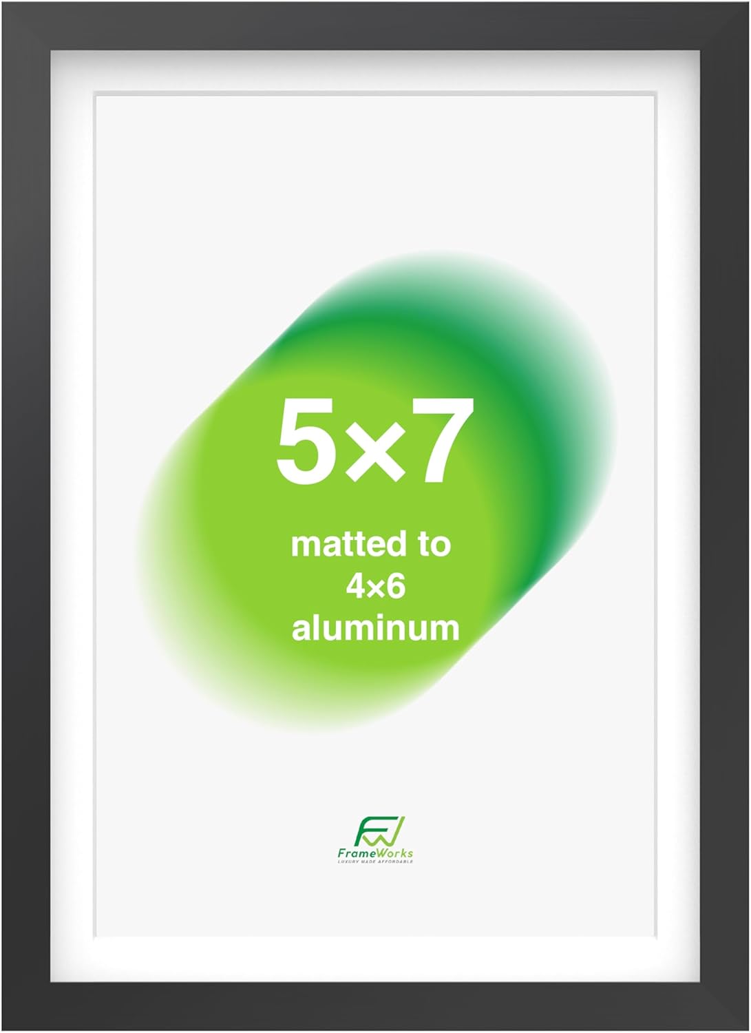 FrameWorks 5x7 Matted to 4x6 Picture Frame – Aluminum Frame w/Tempered Glass, Removable Mat for Photos, Posters, Art, Stylish Wall Frame for Home Decor, Gallery Walls, Office, Living Room - Black