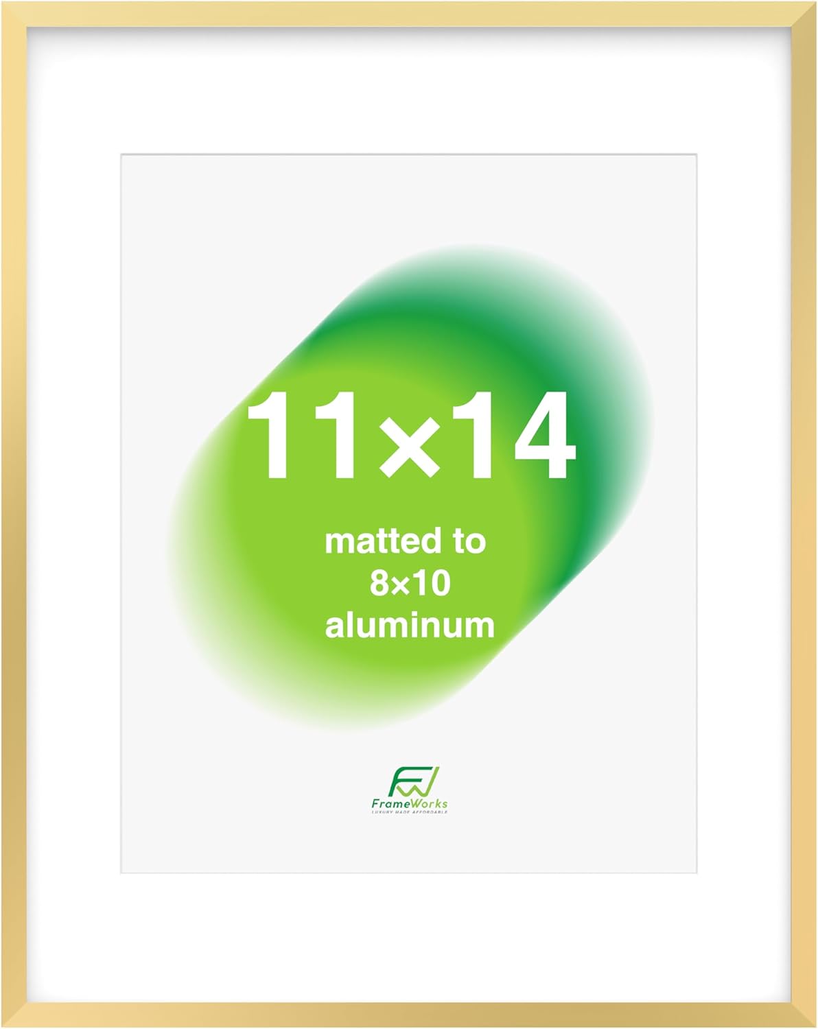 FrameWorks 11x14 Matted to 8x10 Picture Frame – Aluminum Frame w/Tempered Glass, Removable Mat for Photos, Posters, Art, Stylish Wall Frame for Home Decor, Gallery Walls, Office, Living Room - Gold