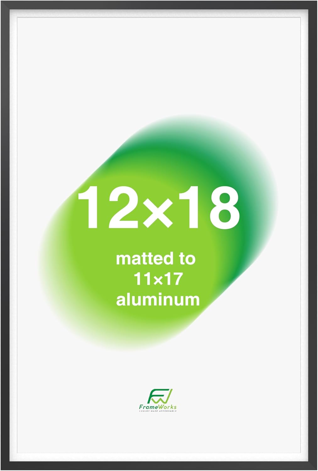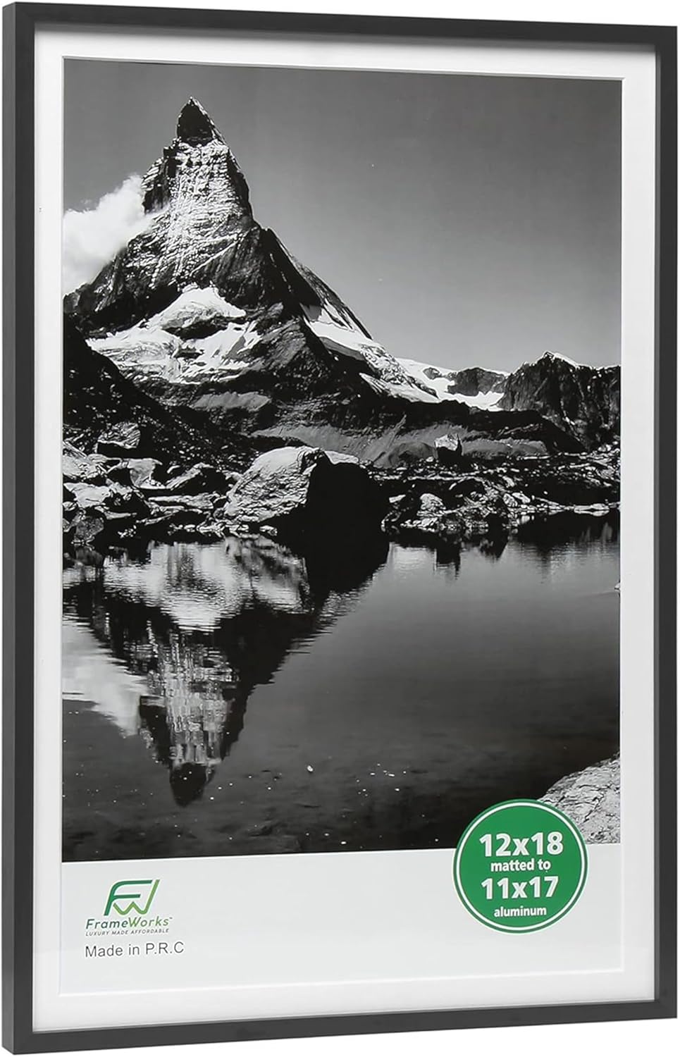 FrameWorks 12x18 Matted to 11x17 Picture Frame – Aluminum Frame w/Tempered Glass, Removable Mat for Photos, Posters, Art, Stylish Wall Frame for Home Decor, Gallery Walls, Office, Living Room - Black