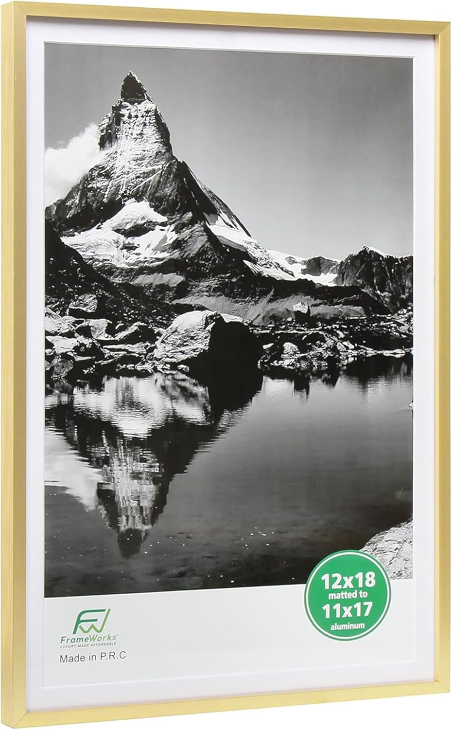 FrameWorks 12x18 Matted to 11x17 Picture Frame – Aluminum Frame w/Tempered Glass, Removable Mat for Photos, Posters, Art, Stylish Wall Frame for Home Decor, Gallery Walls, Office, Living Room - Gold