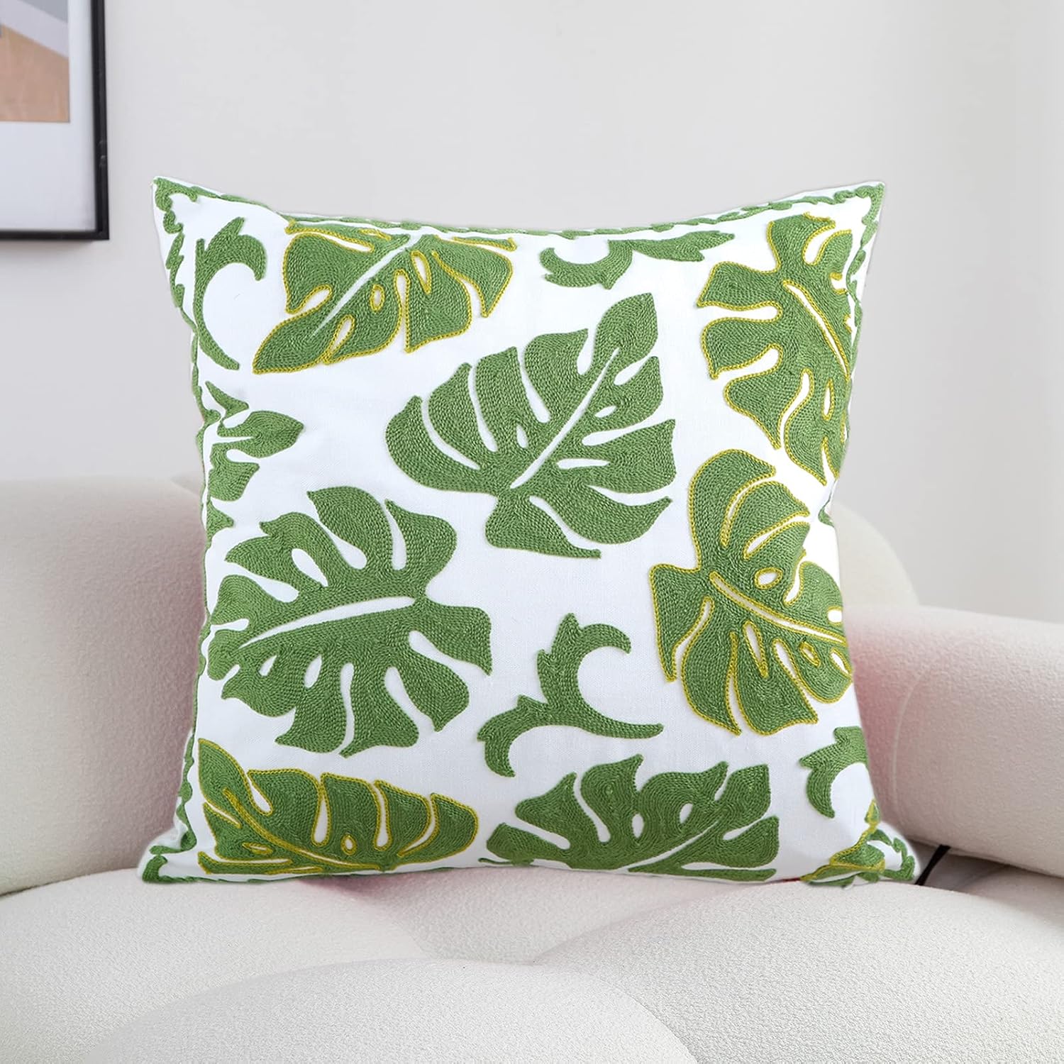 Embroidery Throw Pillow Cover 18x18 Tropical Leaves Home Decor Monstera Leaf Embroidered Green Floor Pillow Cover for Couch Sofa Chair 100% Cotton Cushion Cover Pillow Case 45x45cm, 1 Piece