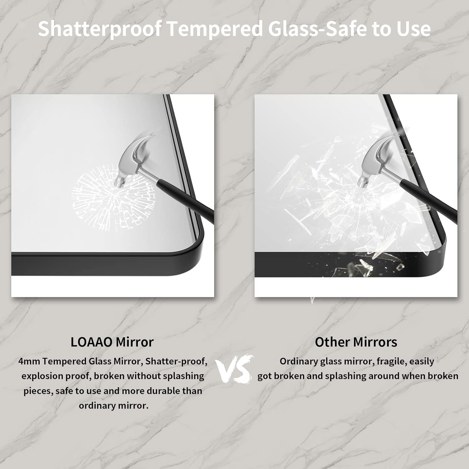 - 【Sturdy Mirror with Premium Materials】: LOAAO black metal mirror is built with 4MM tempered glass which features shatter-proof, burst-proof; Aluminum alloy frame which features anti-rust; Ideal for using in bathroom; Solid and sturdy; Durable for use