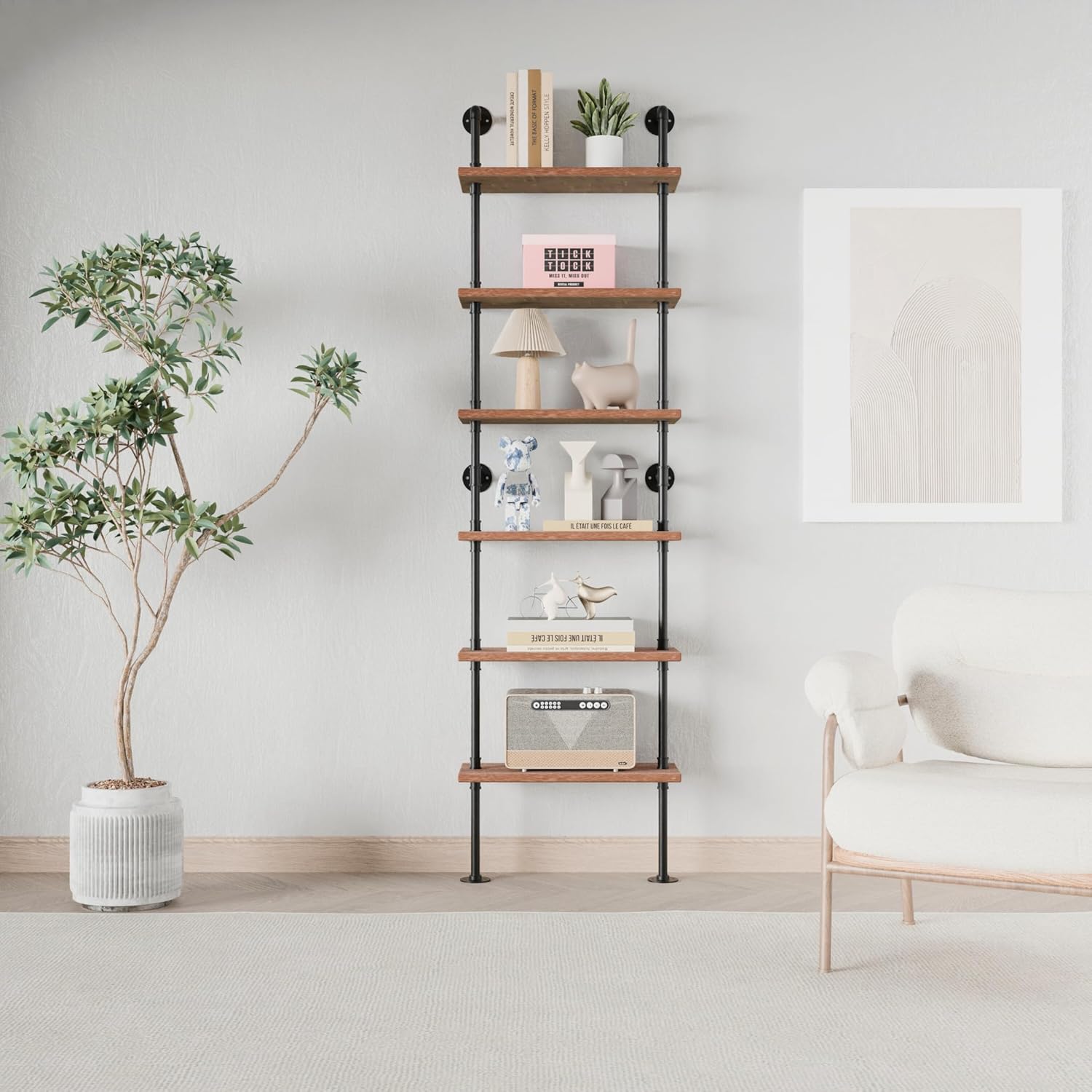 Industrial Ladder Pipe Shelves, Wall Mounted Rustic Bookshelf, Retro Metal Wood Bookcases (Weathered Brown, 6 Tier - 10" D x 24" W x 82.5" H)