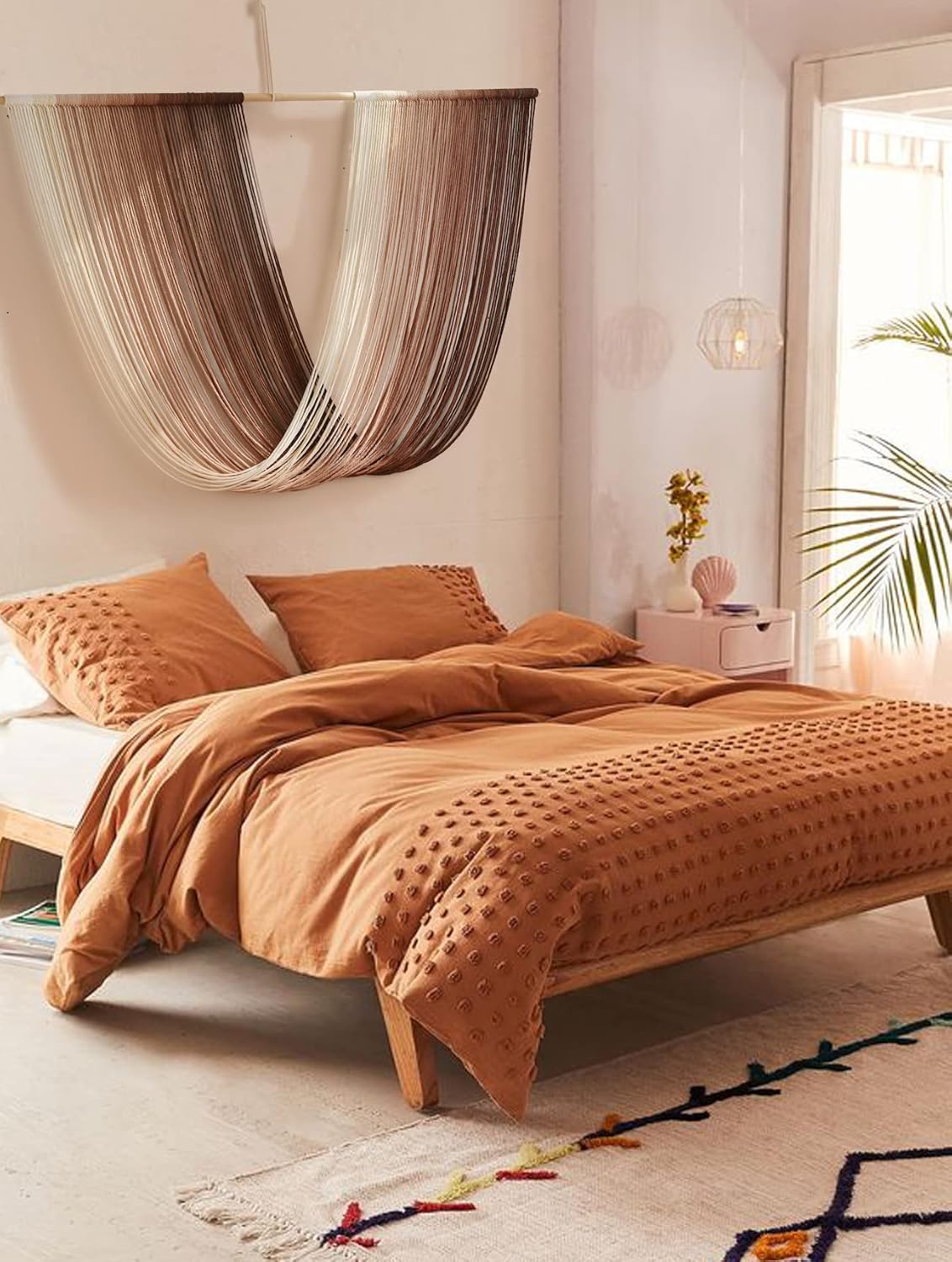 - Function:If you have a blank wall that just needs a little something, add this modern macrame piece for a chic, stylish design statement.Dip-dye macrame wall hanging With oversized design, it is immediately adds a ton of tactile and visual impact to your walls, and it is perfectly fit in a bed headboard,living room,gallery wall,fire place,couch,boho bedroom decor,entry,hallway,nursery or console ect.These also look wonderful suspended from a ceiling to add extra dimension to your space.